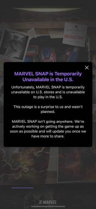 “Unfortunately, Marvel Snap is temporarily unavailable in U.S. app stores and is unavailable to play in the US. This outage is a surprise to us and wasn’t planned,” said Marvel Snap developer Second Dinner. “Marvel Snap isn’t going anywhere. We’re actively working on getting the game up as soon as possible and will update you once we have more to share.”