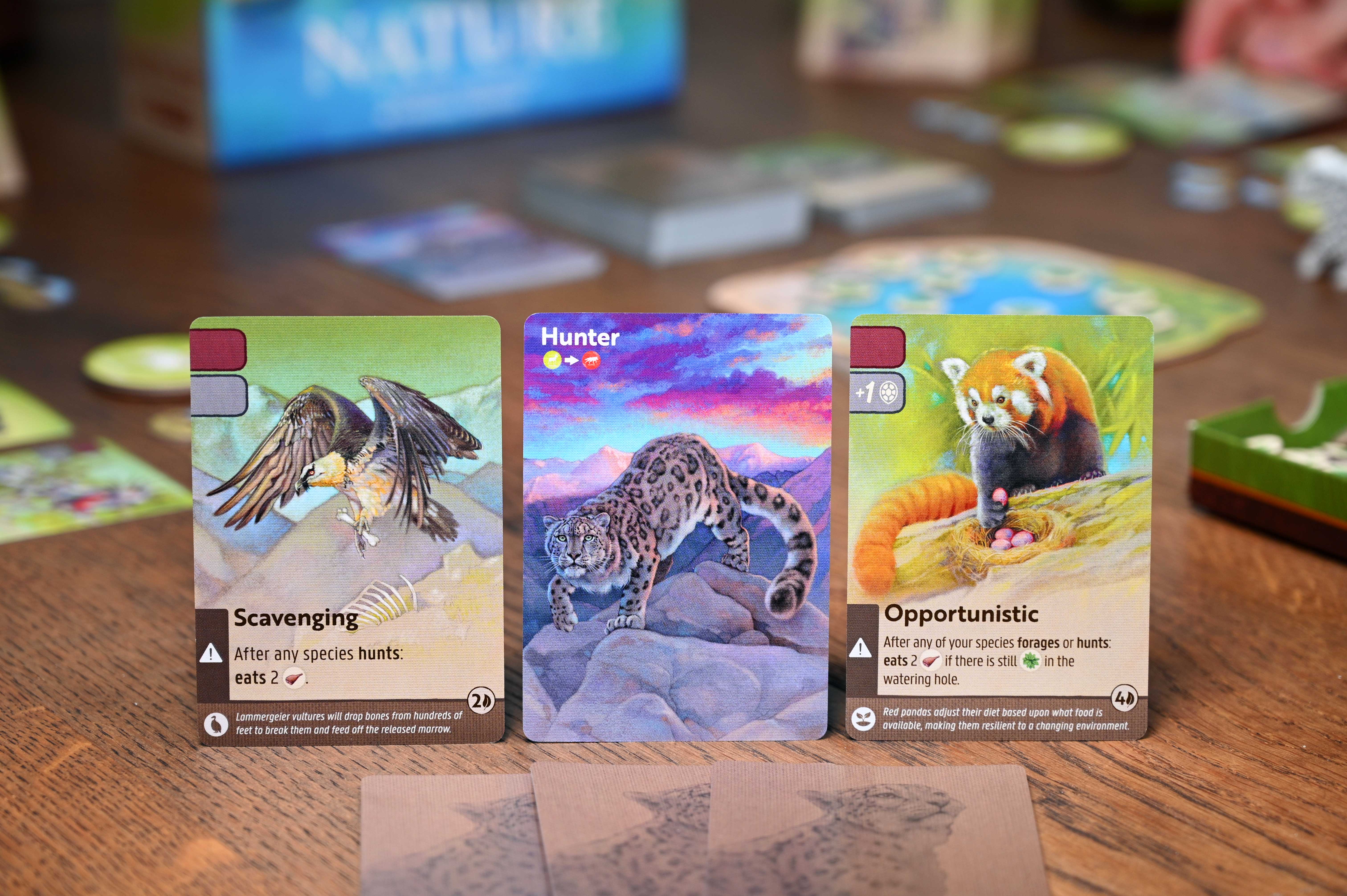 What’s marvelous is that the system is ostensibly a tableau builder. This is a style of game, popularized by games like Race for the Galaxy and 7 Wonders, where players place cards in their own personal area, creating an engine to generate points or resources. Nature twists this formula to create dynamic isolated tableaus that represent player-crafted species. So instead of managing a single tableau, players construct and manipulate several small sets of various properties. It’s a clever concept, using an existing mechanism to craft an ecosystem of evolving entities that must continually change in order to adapt to their environment.