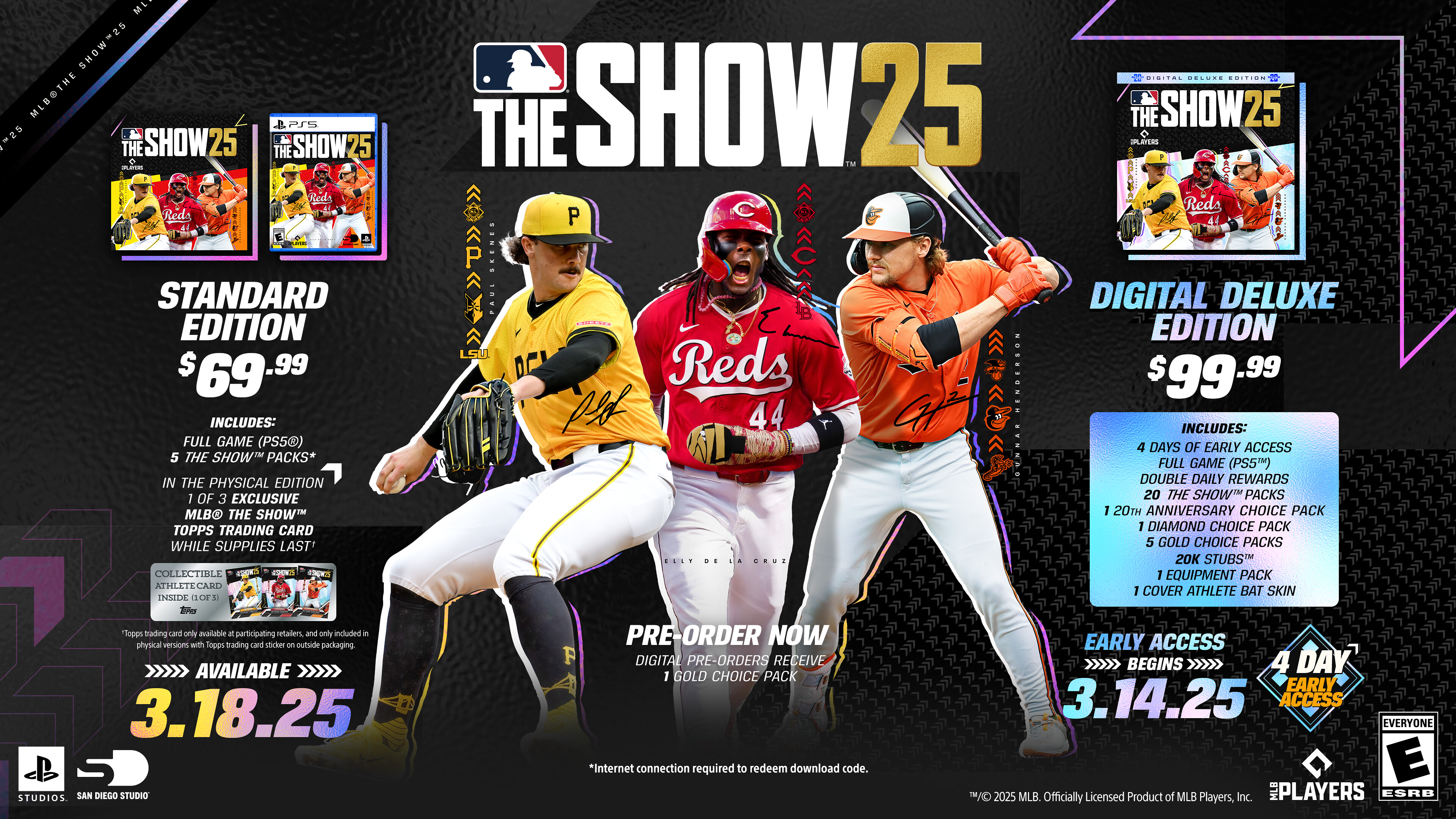 For all the fans, make sure to sign up for the MLB The Show Scouting Report to stay updated on all the latest features, updates, and legends coming to MLB The Show 25, while unlocking amazing rewards along the way. Starting in April 2025, subscribers will receive a unique exclusive pack every month through December 2025*, packed with incredible in-game rewards. Plus, the Golden Ticket Sweepstakes will return, with winners selected every month for amazing prizes like Packs, Stubs, clothing, autographed items from Elly De La Cruz, Gunnar Henderson, and Paul Skenes, along with even more surprises we can’t wait to reveal. Don’t miss out—sign up today on theshow.com