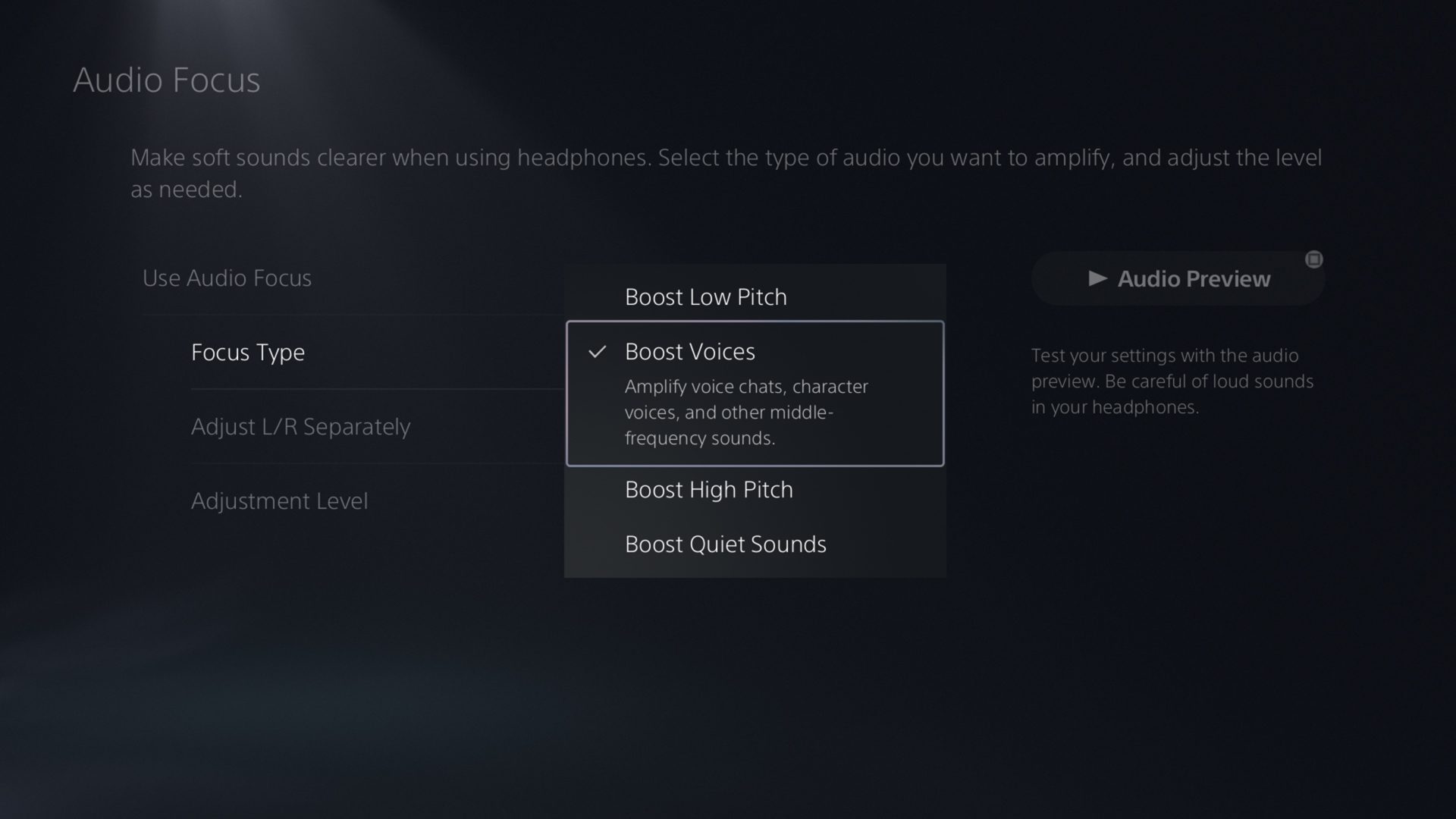 When the audio focus setting is turned on, you can choose from a range of preset options which makes it easier to distinguish sounds like in-game character dialogue, subtle sound effects such as footsteps and rustling grass, as well as voices in party chats for a more immersive gaming experience.