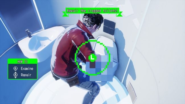 Besides the freely-available toilet in Travis’ motel room, other public toilets are available, once they are unclogged before their first use in a minigame involving the analog sticks. These are funny mechanics, if potty humor appeals to you, that is.