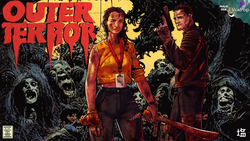 Outer Terror’s inspirations are clear from the jump: pulpy horror comics and B-movie horror from the 1980s and 1990s with a dash of arcade fun thrown in for good measure. In the game, you’ll choose from one of 10 survivors to control, each with their own unique weapons and skills, to face off against waves of enemies. You can play by yourself, but you can also team up with a friend via two-player co-op.