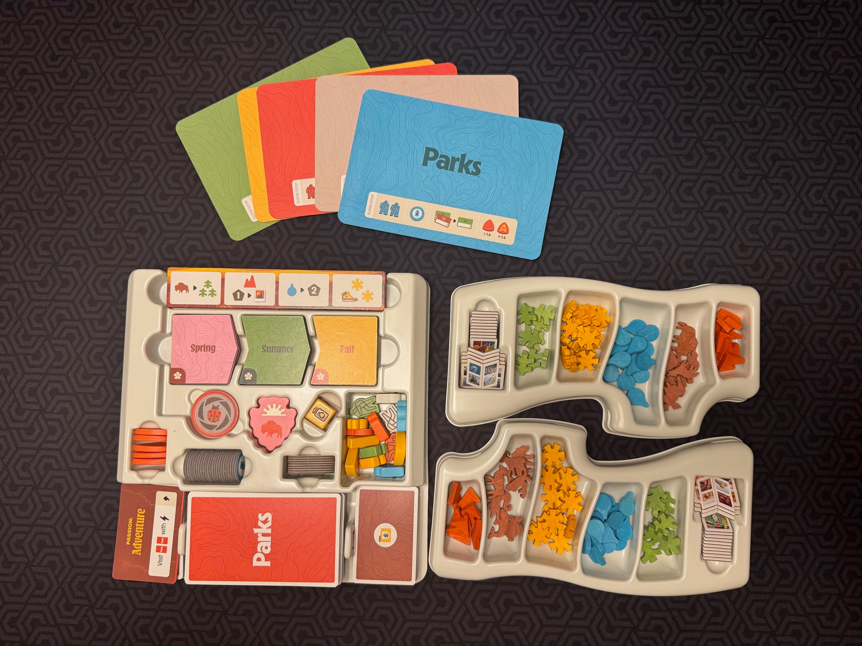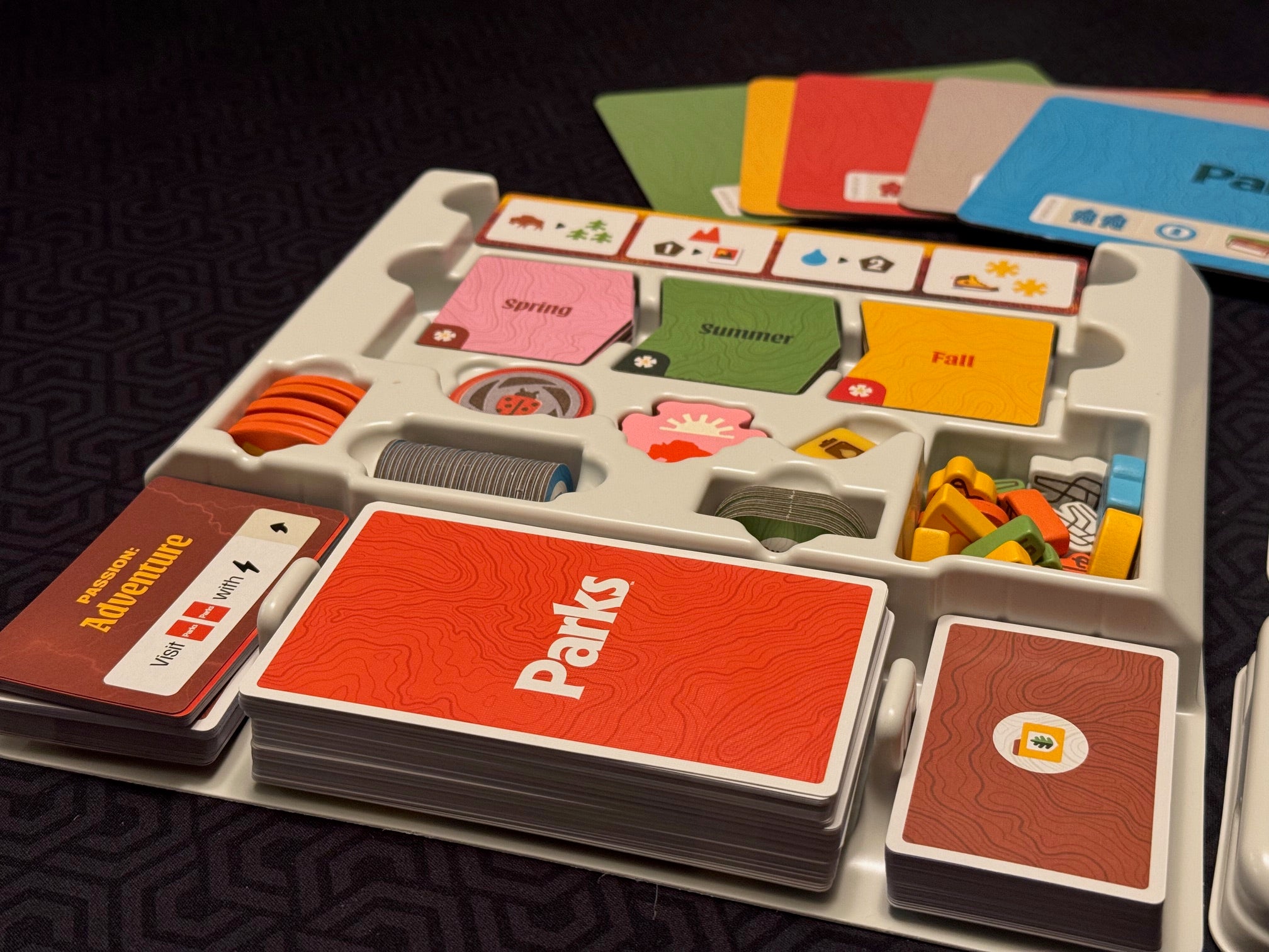 The real standout is the built-in storage tray at the bottom of the box, which is the best I’ve seen across the 60-plus board games I own. Everything has its place, from tokens and tiles to dice and cards, all packed efficiently to keep the game’s footprint compact, while making cleanup a breeze. The tray holds decks for the Parks, Gear, Passion, Ranger Teddy, and Volunteer Projects cards, along with solo reference cards, Season and Campsite tiles, Photo and Hiker tokens, Trail Site tiles, and more.