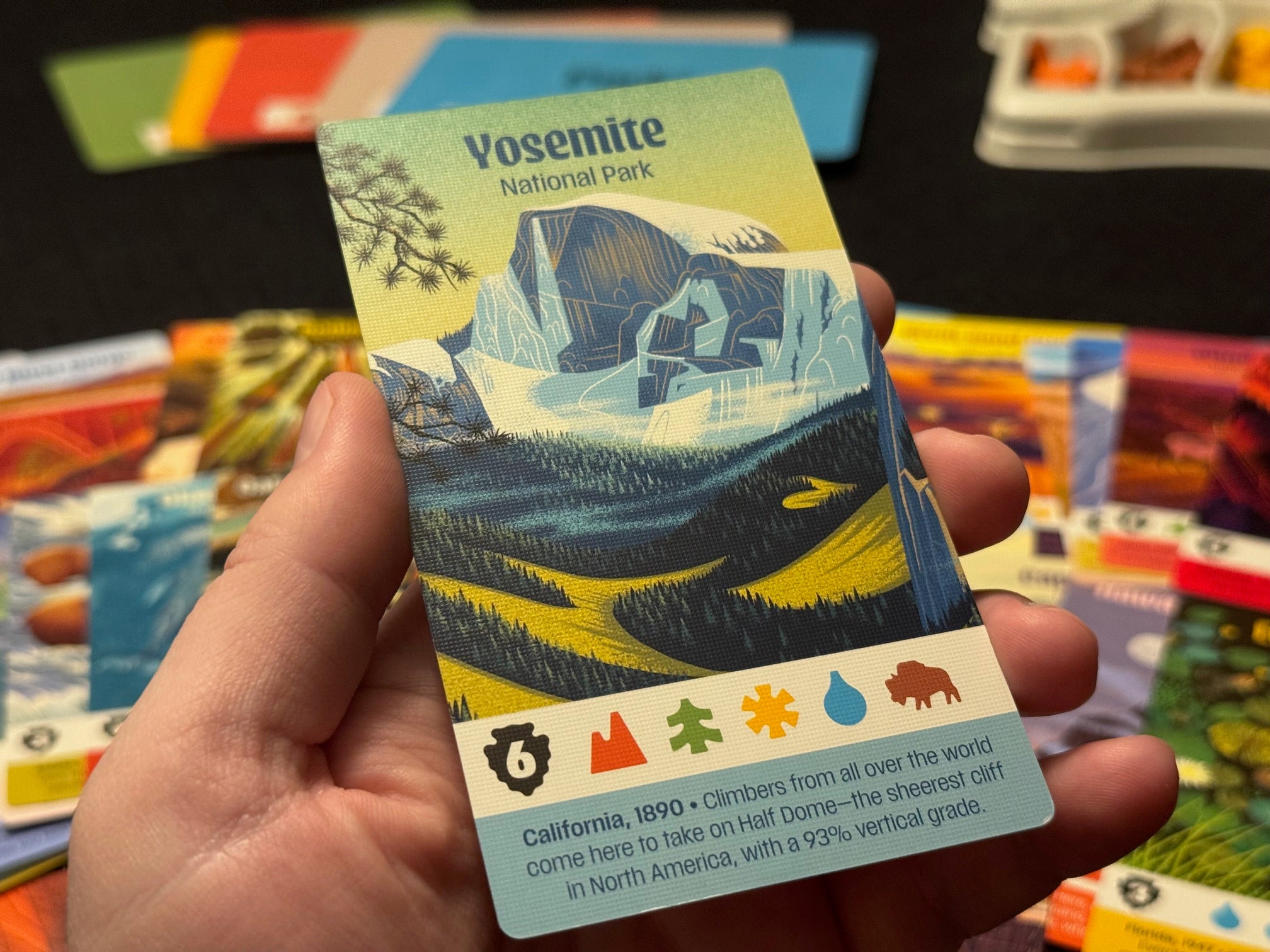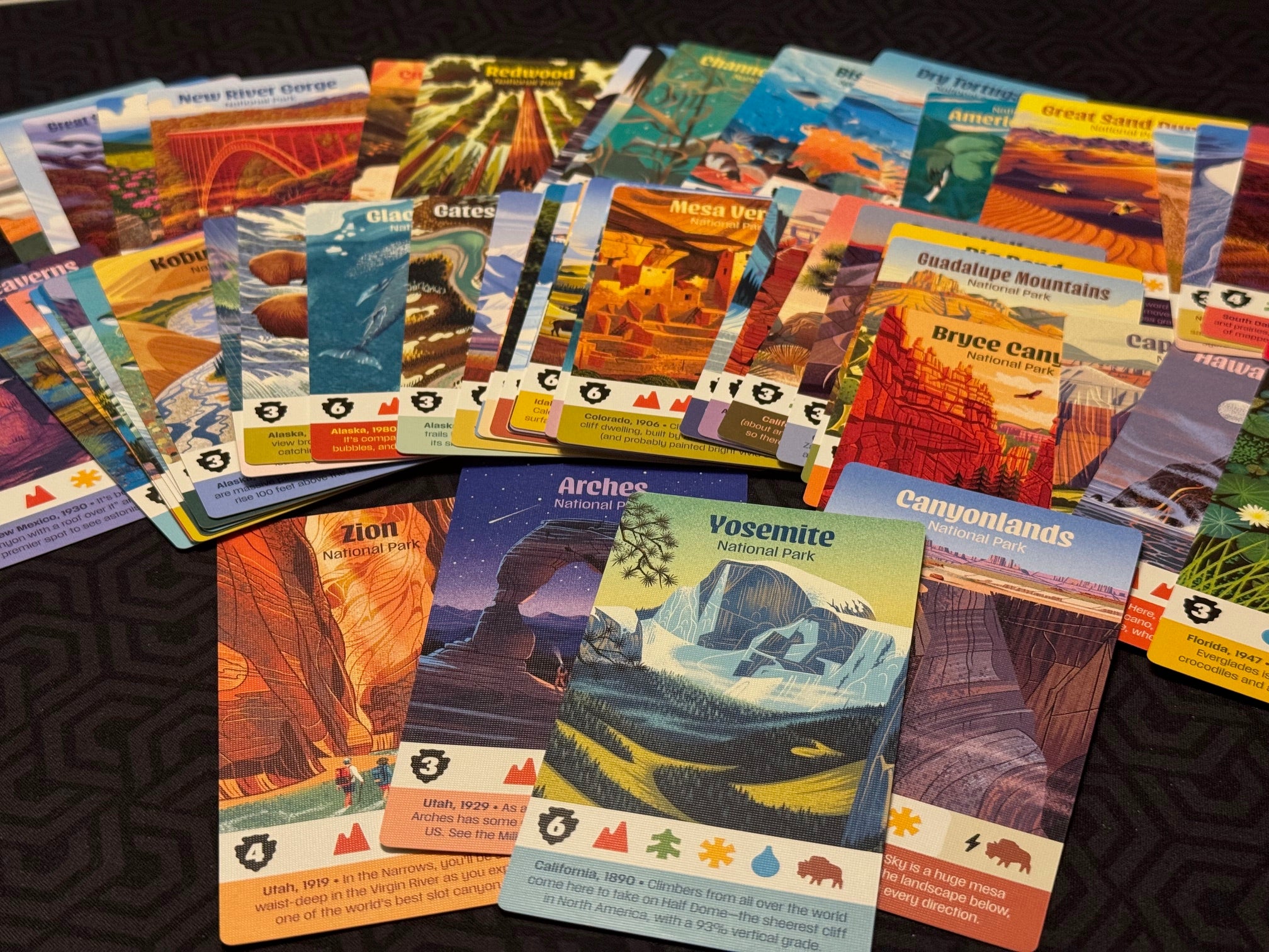 One of the biggest updates in the 2nd Edition is the expanded card set, which now includes all 63 U.S. National Parks, up from 48 in the original. The cards feature all-new artwork and clean iconography that better matches the game’s updated, more colorful design. While some fans may miss the original illustrations from the Fifty-Nine Parks print series, the new art feels more cohesive and fits well with the rest of the game’s style. Each card includes the park’s name, founding date, and a short blurb about what makes it unique.