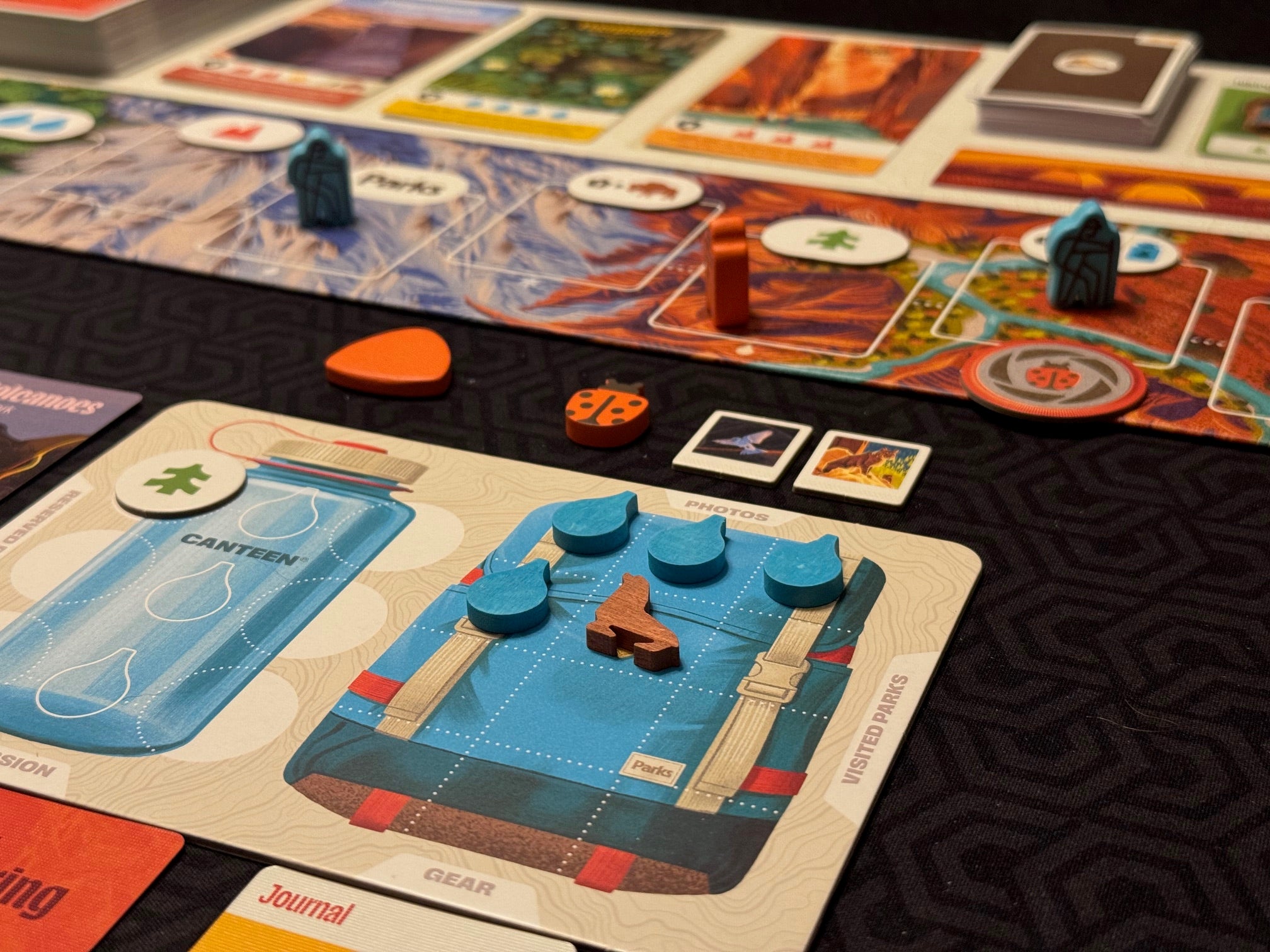 Each player gets a board featuring an empty backpack and water bottle, with clearly marked sections around the edges for organizing visited and reserved parks, purchased gear, and more. The Backpack holds up to 12 resources, while the water bottle has six spaces for Canteen tiles you can fill as you play.