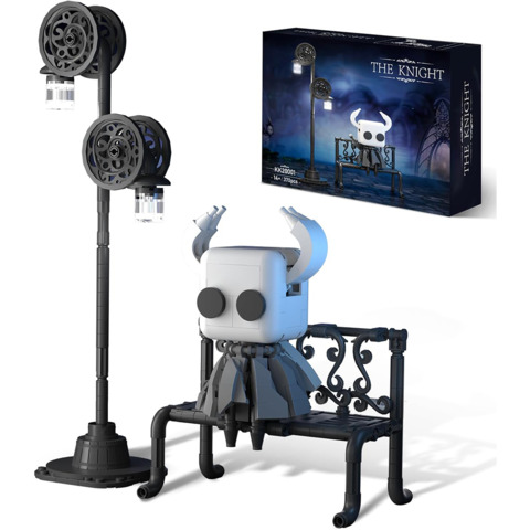 For a slightly larger kit, there’s an almost identical The Knight set from another Lego knockoff brand, Mavo Brix. This 370-piece version features all the same elements as the BuildingBoat set, but scaled up a bit, with a 6.3-inch Hollow Knight figure, a 5-inch-wide bench, and a 10.6-inch light-up street lamp. This kit is $18 at Amazon.