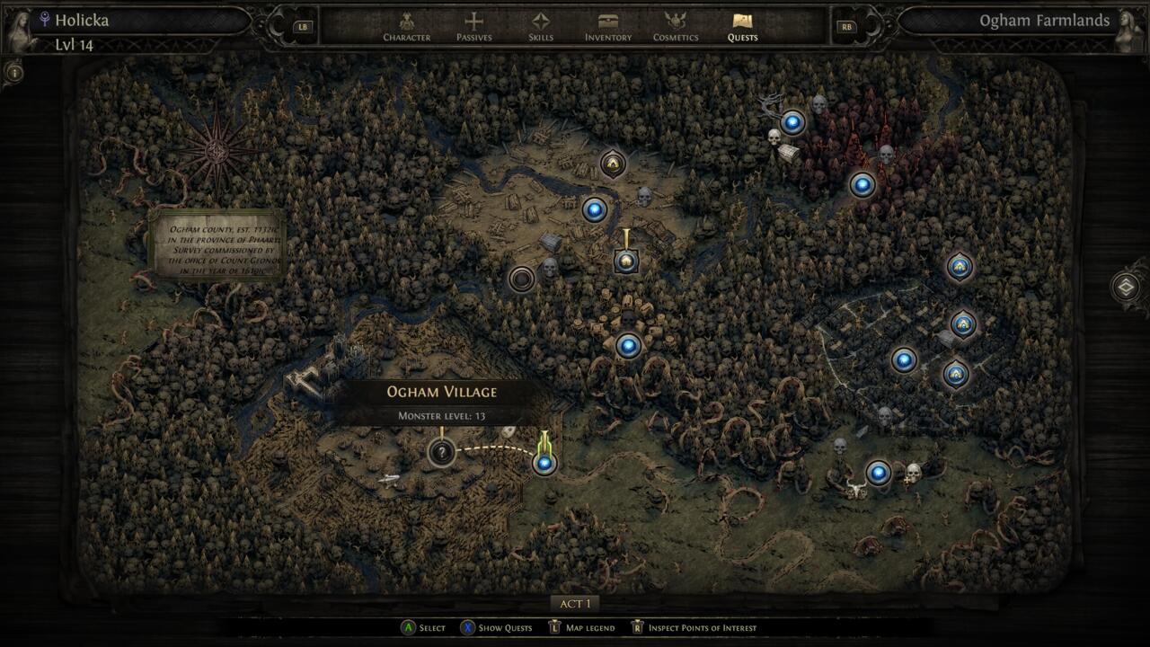 When the game says “the Village” in your quest objectives for The Trail of Corruption, they’re really referring to “Ogham Village.” Ogham Village is a level 13 location in Act 1, and it’s southwest of the Clearfell Encampment on your world map.