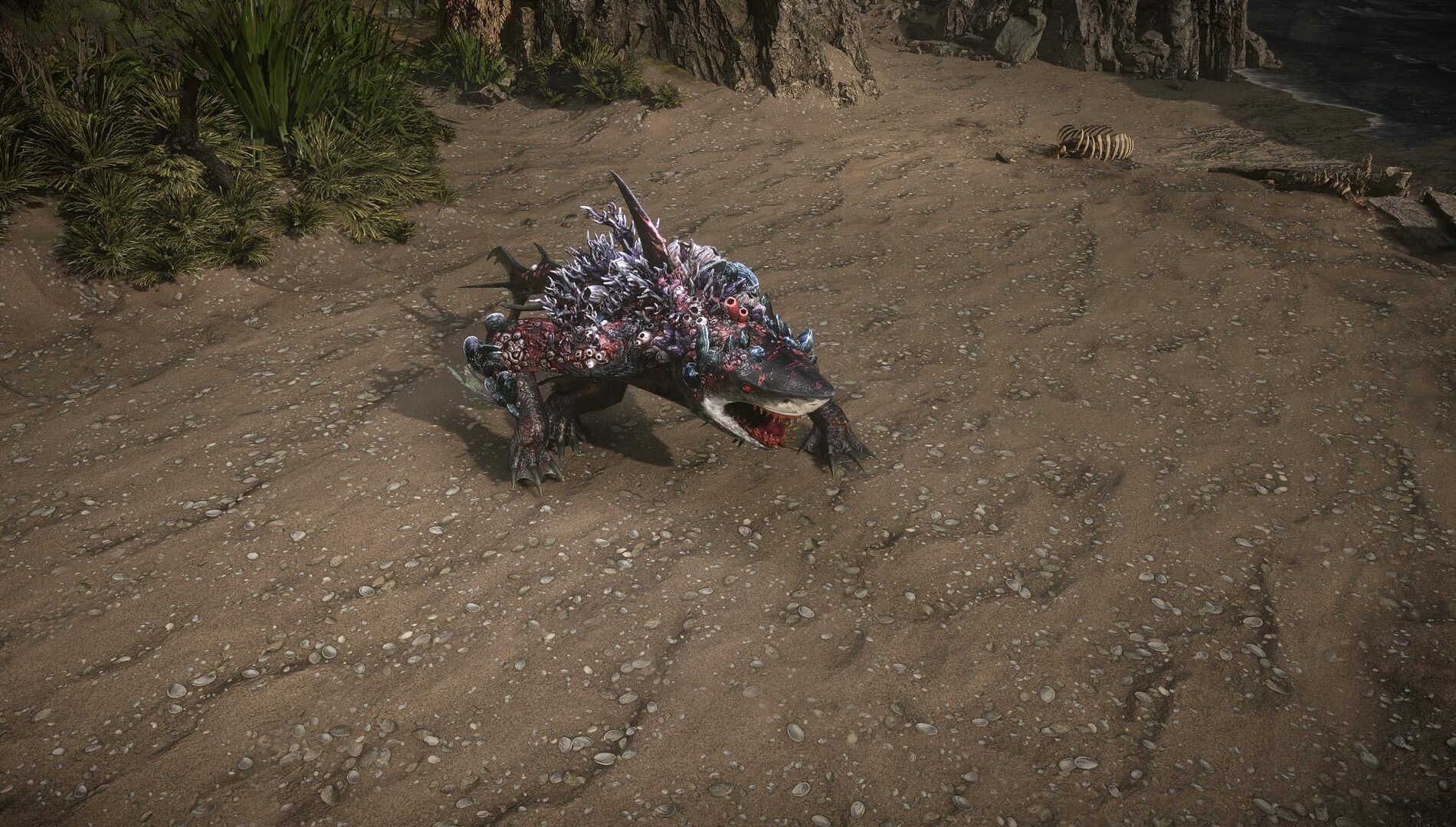 The Great White One is a shark – at least at first. As you approach the edge of the rocks on its island you’ll see its fin swim by. You feel safe and comfortable on land, but only for a moment – because, in short order, it will leap out of the water to reveal a very unexpected form. It’s at this moment the player will think “Of course I should have seen this coming… It’s Wraeclast!” as you begin in an epic battle against this land-shark, which attacks with vicious bites and tail swipes, and frequently burrows underground to attack you from below. If it manages to land a bite on you, you’ll find it frenzied by your blood loss, making its attacks more accurate, and more deadly.