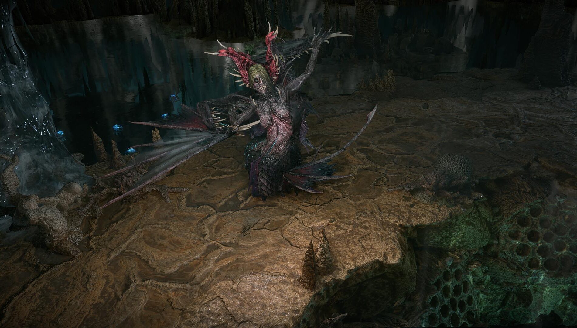 Diamora is an awesome boss fight that utilizes some pretty difficult mechanics. Diamora initially appears as a Siren, singing and conveying absolute beauty as she shines and maneuvers in the serene water filling her arena. As you approach, you are lured in by her voice and glow. Just as you get close, that’s when things turn dark – she immediately goes into the water, and what emerges is the opposite of what initially brought you there. She is a mutant hybrid fish creature that uses a human form to attract people in to be eaten.