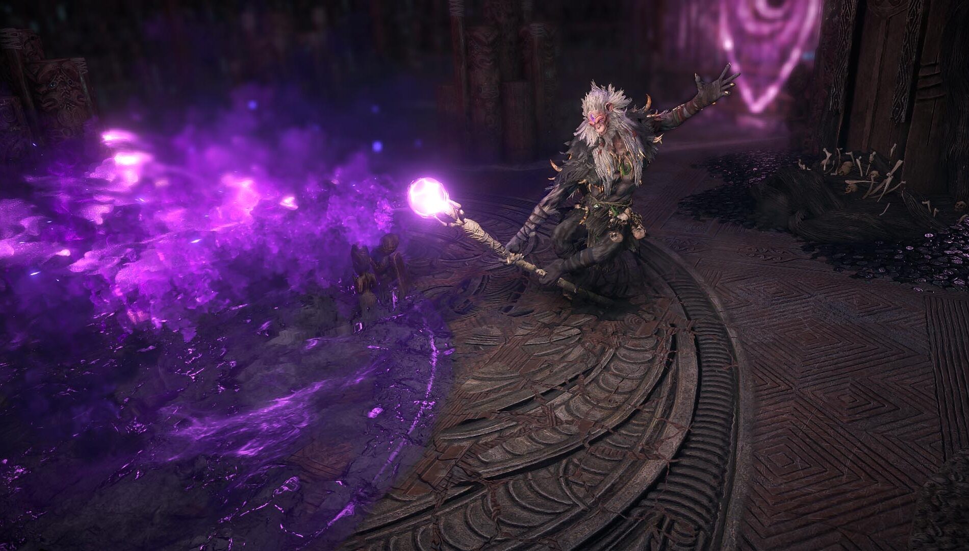 Yama, the White combines high agility combat with two powerful spells to truly test your limits. He is extremely agile, able to maneuver around the arena with ease, and jump on top of clusters of totems to get a height advantage over you – only to flip off them, slamming down back onto you. On top of that he embraces Chaos Magic, a type of damage rarely seen in Wraeclast, which shreds your Energy Shield, and your Life.