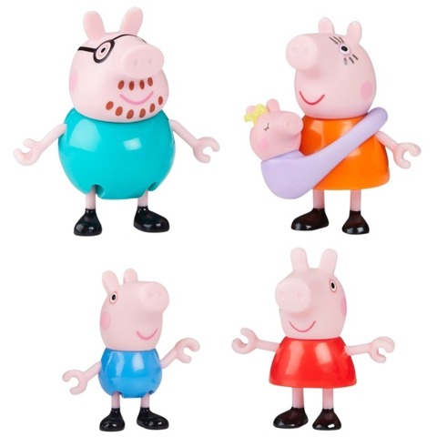 This collection features figures Daddy, Mummy, George, and Peppa, plus a baby carrier accessory with Evie that attaches to either Daddy or Mummy. All four figures feature interlocking hands.