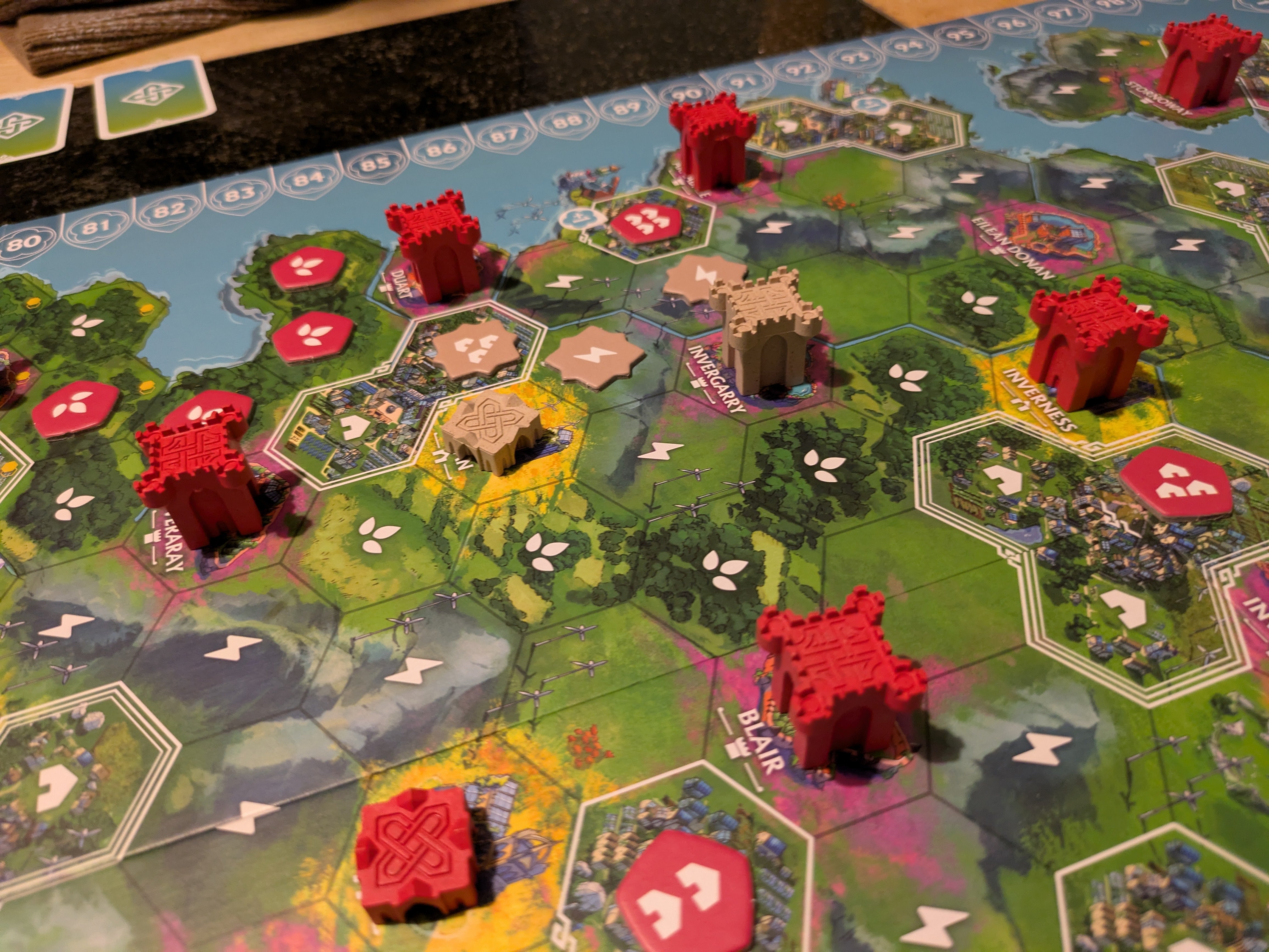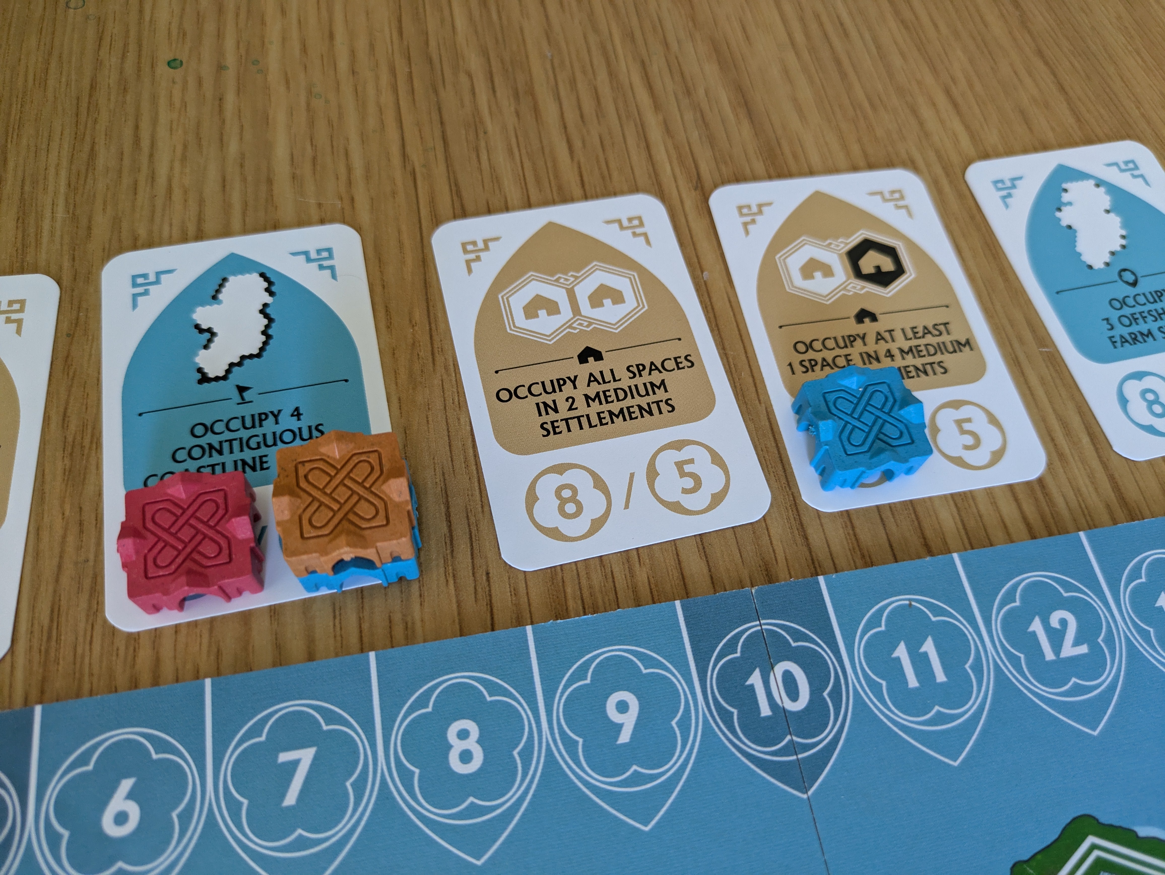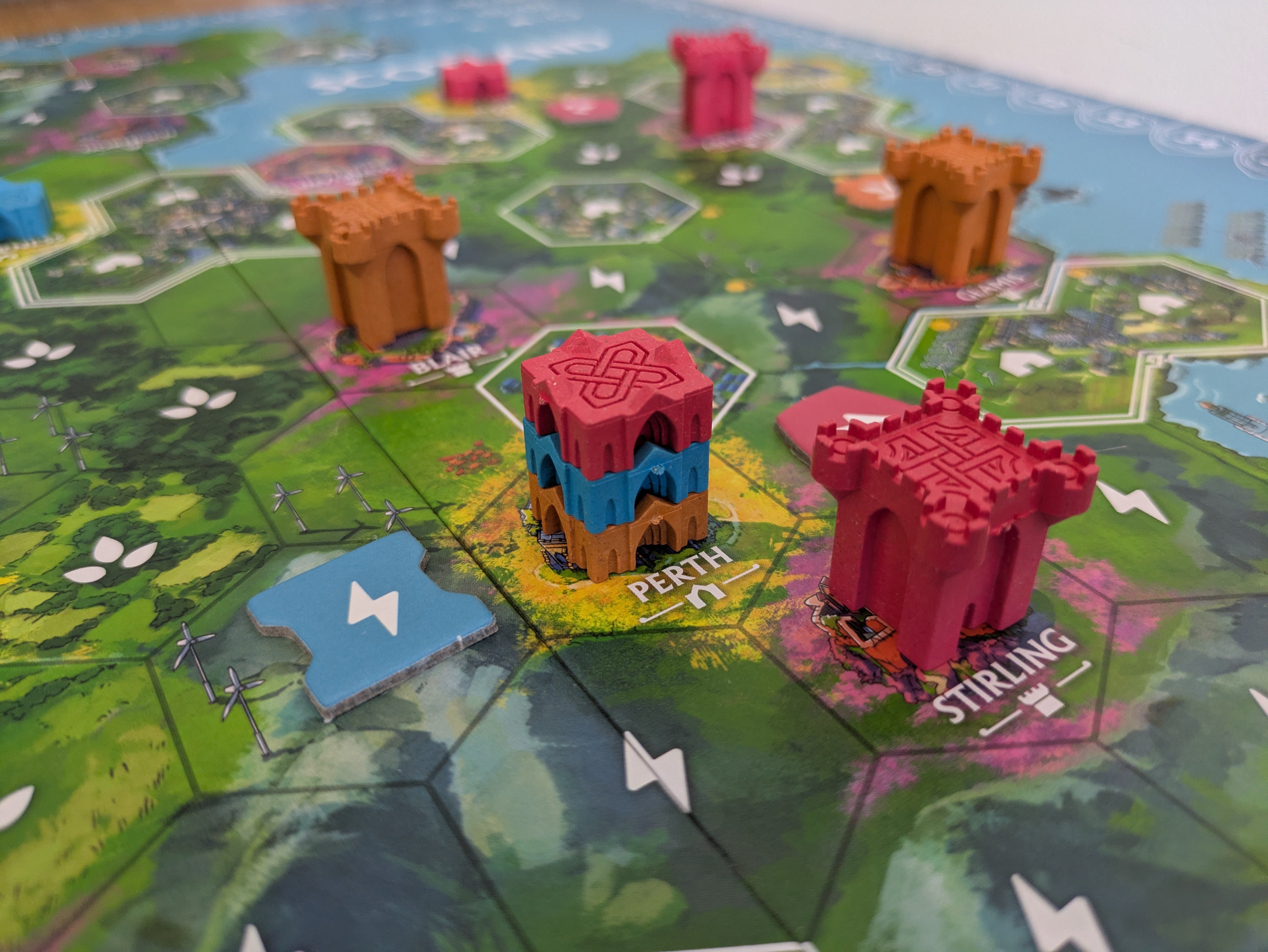 It’s almost too much in terms of adding to the decision-making, especially for more casual players, but it’s inarguable that it’s an effective way to address concerns that the Scotland side of the board is too straightforward. However, it can weirdly reduce the sense of competition for board space that Scotland has. With so many other priorities, the uncertain rewards of blocking other players, or trying to steal their castles, tend to take a backseat. Over time, as you get used to all the competing demands, Ireland shows its own rewards as a slower, more reflective, but still very engaging version of the game.