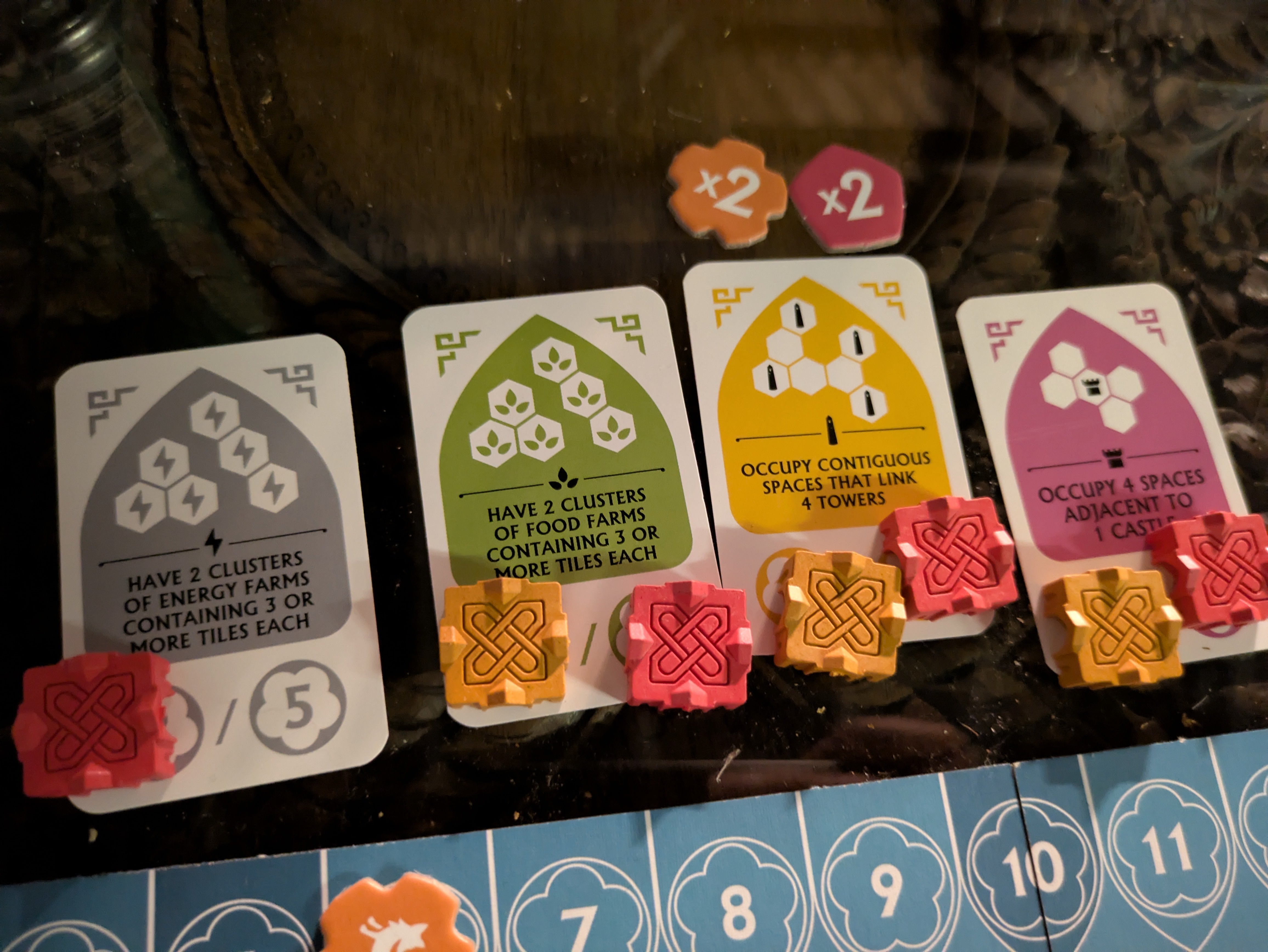 This, of course, is the ideal time to move to Ireland. The basic rules for castles and placement are the same, although there’s a bigger town and a lot of unmarked hexes where you can place either food or energy tiles as you prefer. Cathedrals have been replaced with towers, adjacency to which wins you a bonus depending on a random tile assigned to the tower such as a score bonus, or an immediate extra turn. The mission cards you earned from cathedrals are replaced with eight public cards which are all a race, giving top points to the first player to complete, and a more modest reward for those who manage it thereafter.