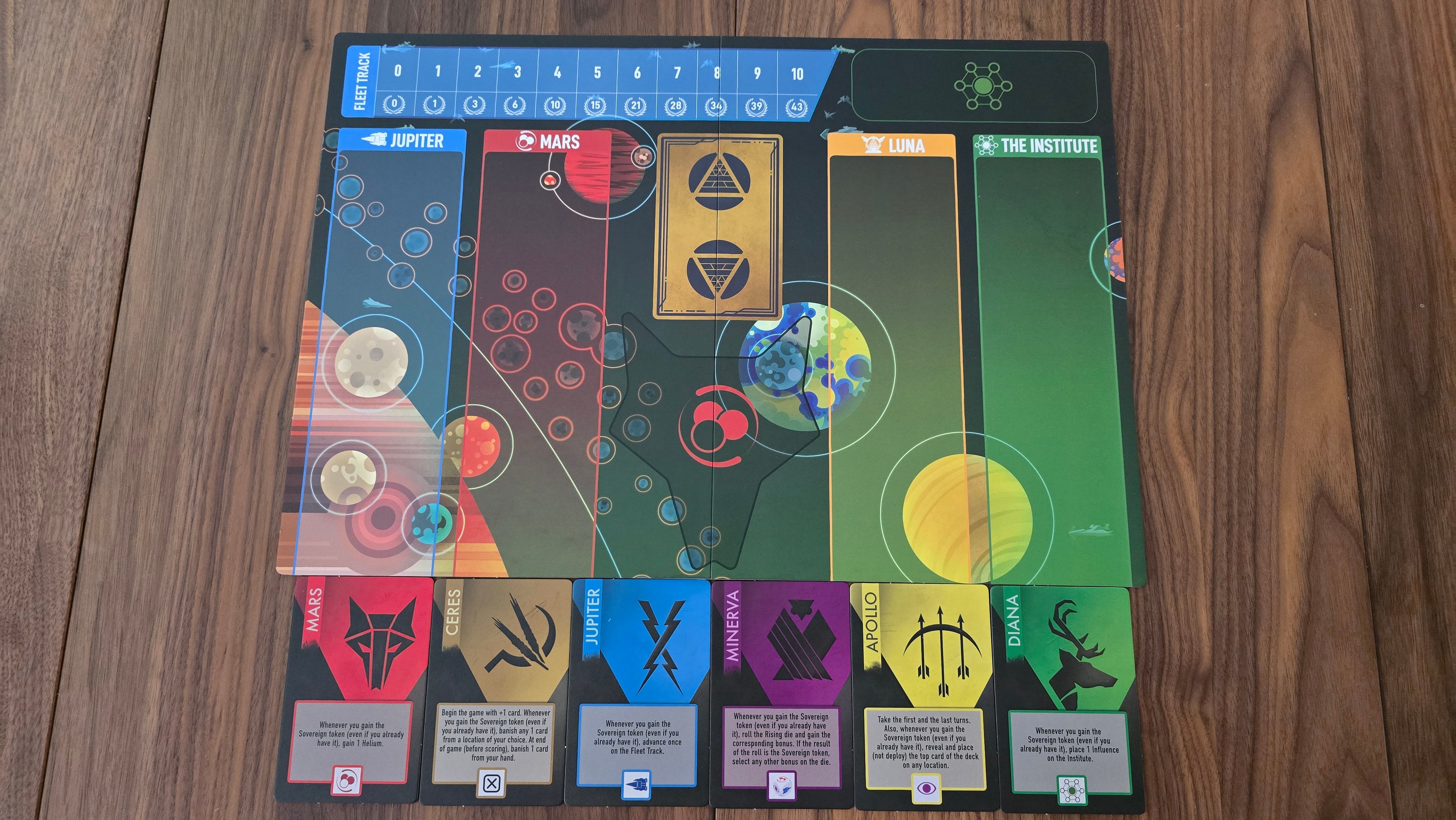 Red Rising TBG is published by Stonemaier Games and designed by Alexander Schmidt and Jamie Stegmaier. You may recognize that name from his other notable games, including Scythe, Viticulture, and his latest, Vantage, which was one of the most popular games at Gen Con this year. The Red Rising adaptation they created puts anywhere from 1-6 players in the roles of heads of various houses from the novels as they vie for power and influence in three distinct areas—the Institute, the Fleet Armada, and Helium-3 production. The houses, Apollo, Ceres, Diana, Jupiter, Mars, and Minerva, all have their special abilities that trigger whenever they manage to claim the Sovereign Token (more on this in a moment), which adds in a small sprinkling of asymmetry to the package.