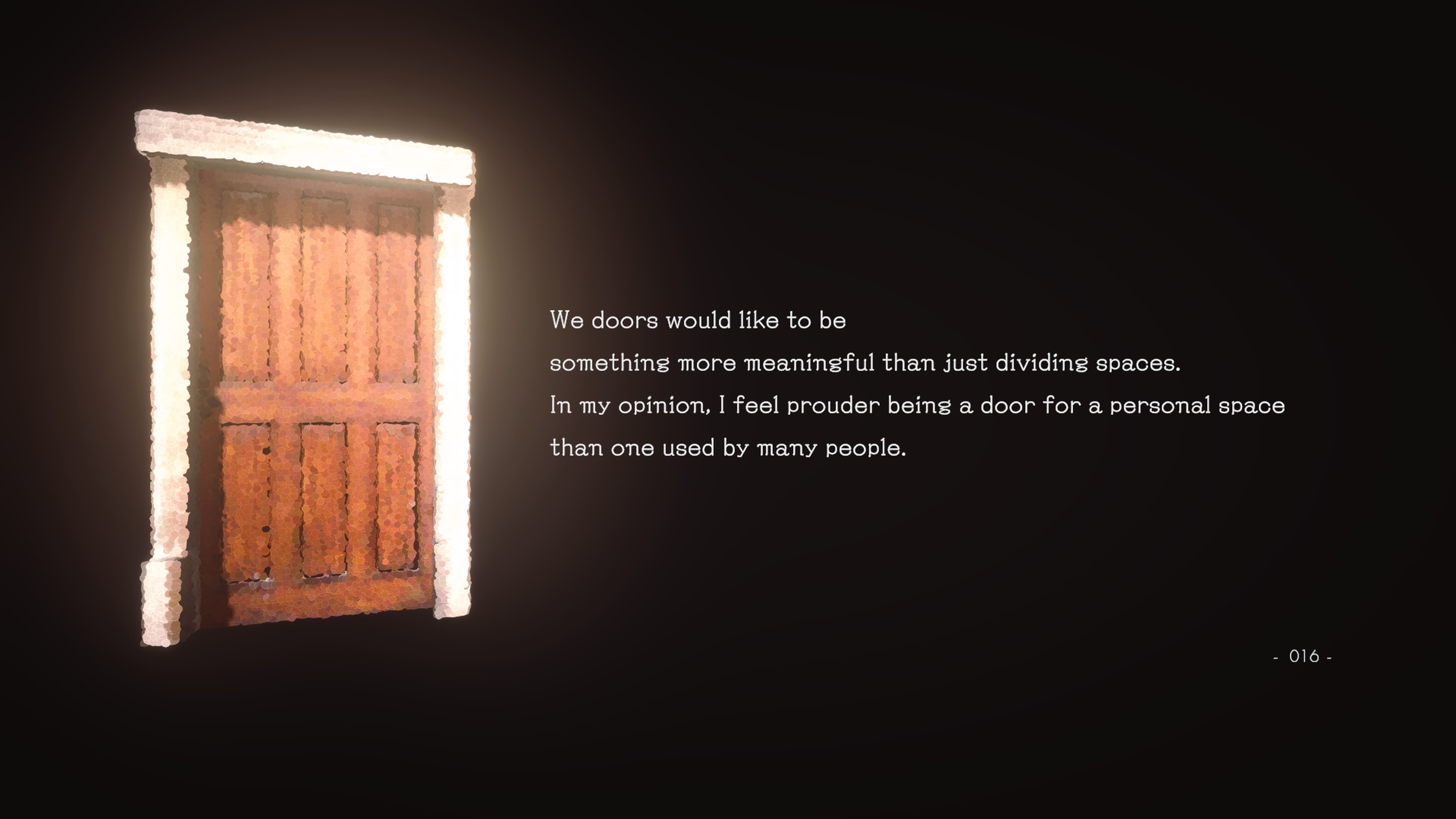 Imagine doors having a variety of preferences and ways of thinking. In the dialogues, nothing is imposed as “right” or a conclusion. I wanted players to reflect on their own environment, access past memories, and have a moment of reflection.