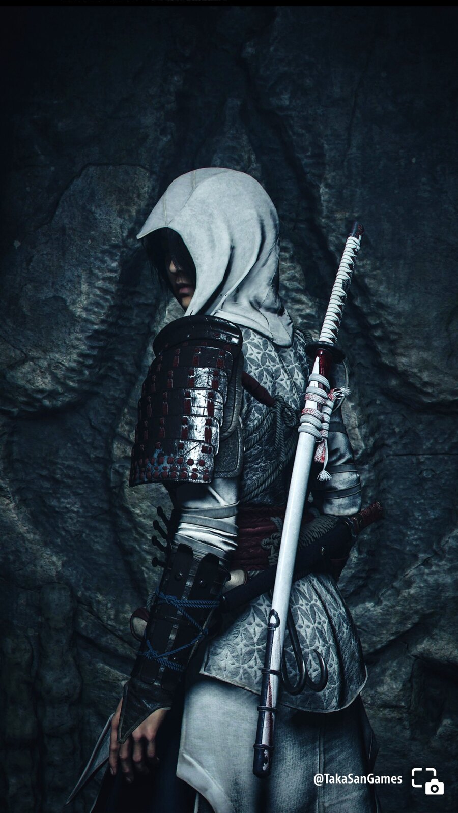 TakaSanGames shares Naoe in traditional Assassin white, in front of the Hidden Ones symbol