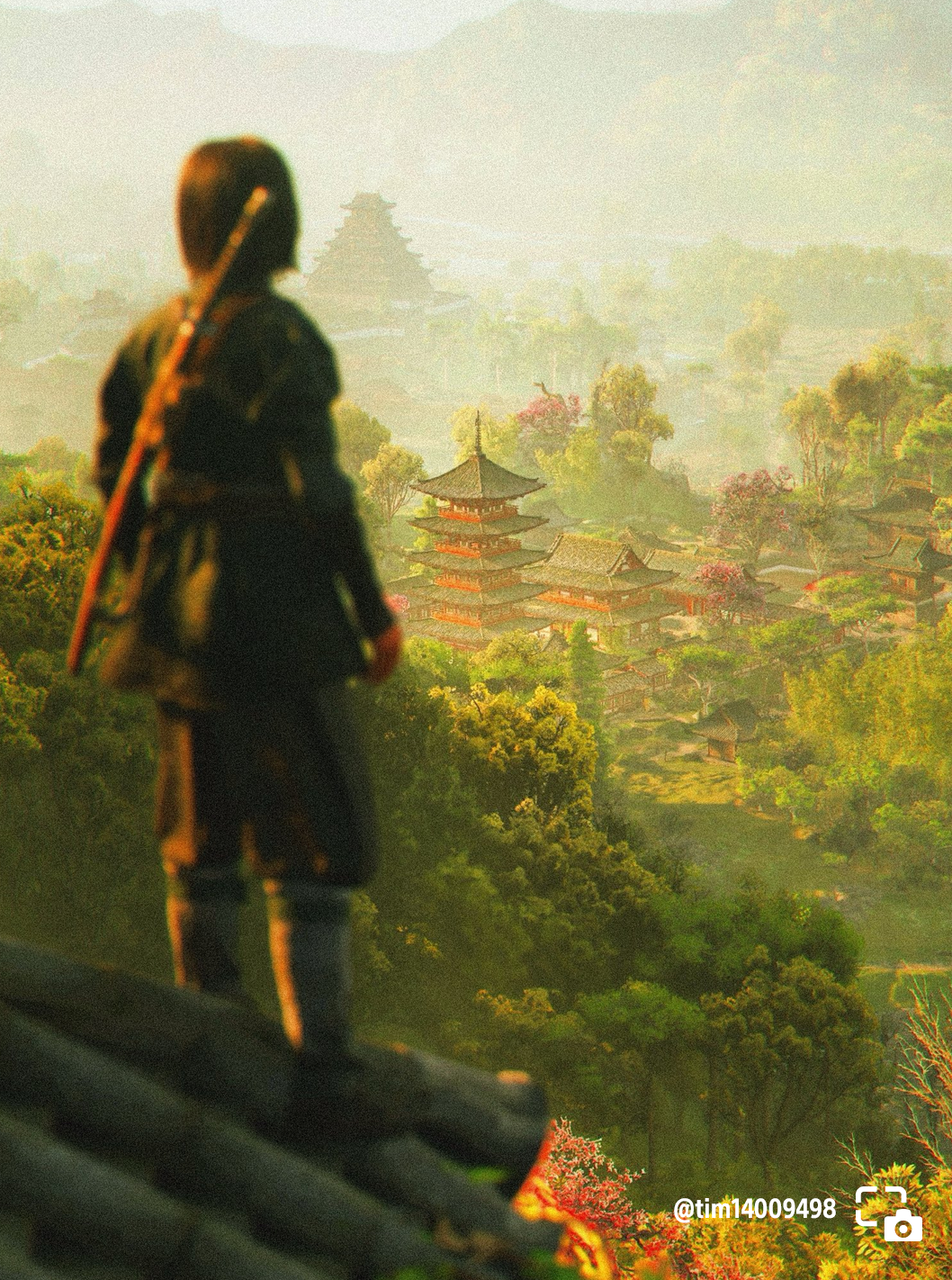tim14009498 shares Naoe atop a roof overlooking a settlement in fall