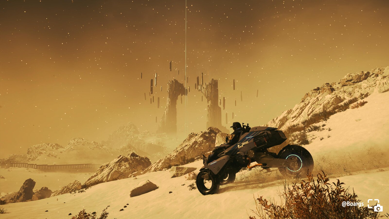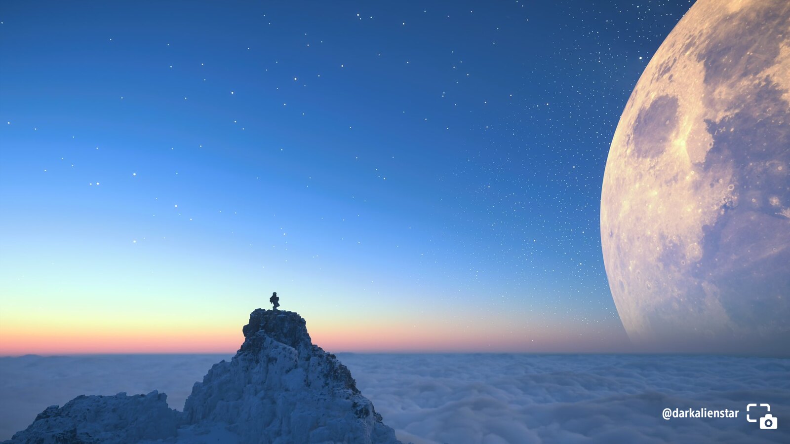darkalienstar shares a zoomed out shot of Sam atop a mountain, with a massive moon cresting.