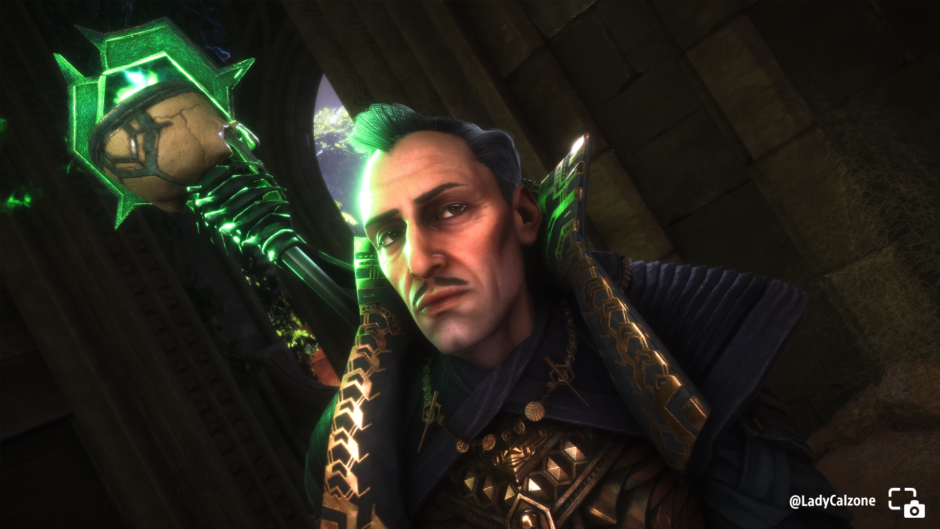 LadyCalzone shares a portrait of Mourn Watcher Emmerich bathed in the green glow of his staff.