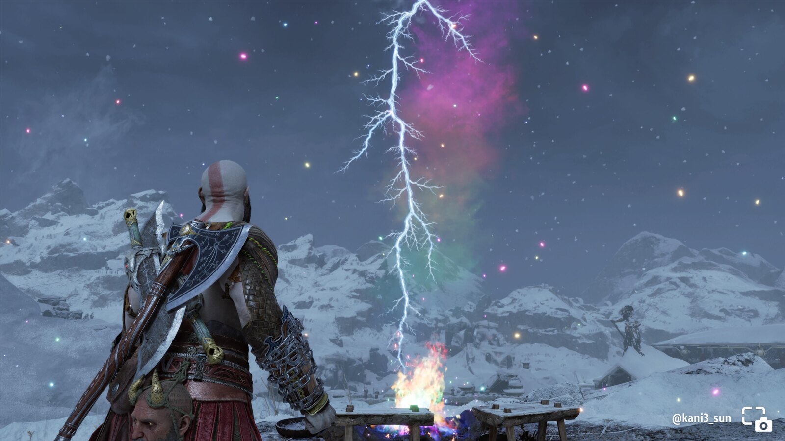 kani3_sun shares Kratos looking out at a snowy Midgard, with a frozen lightning bolt in the center of the landscape