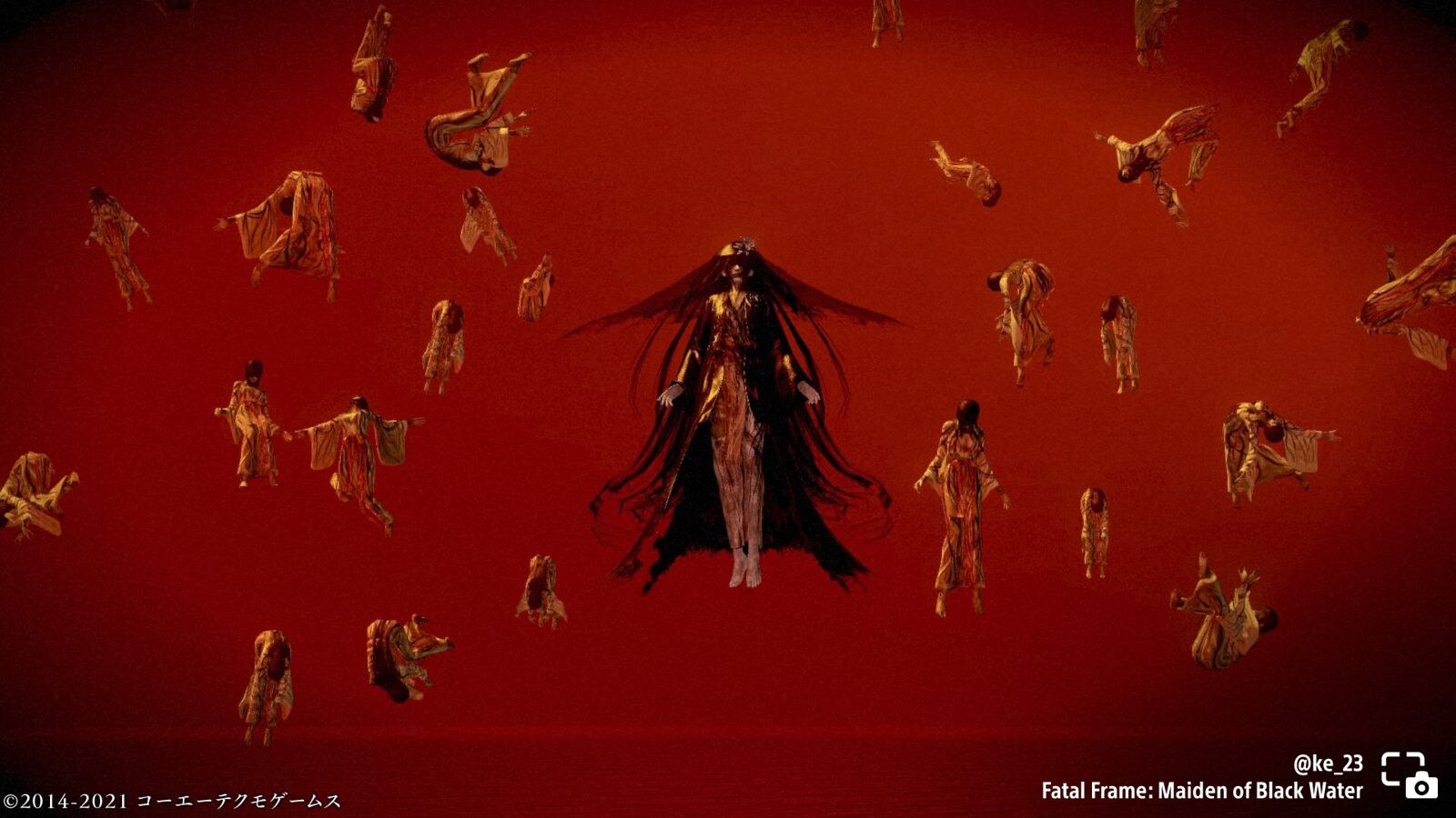 ke_23 shares a series of robed women floating in various positions across a red background in Fatal Frame: Maiden of Black Water.