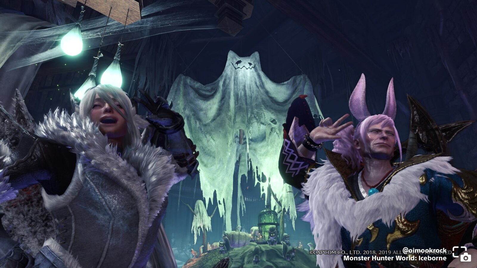 oimookrock shares players posing near a hanging Palico Ghost decoration in Monster Hunter World: Iceborne.