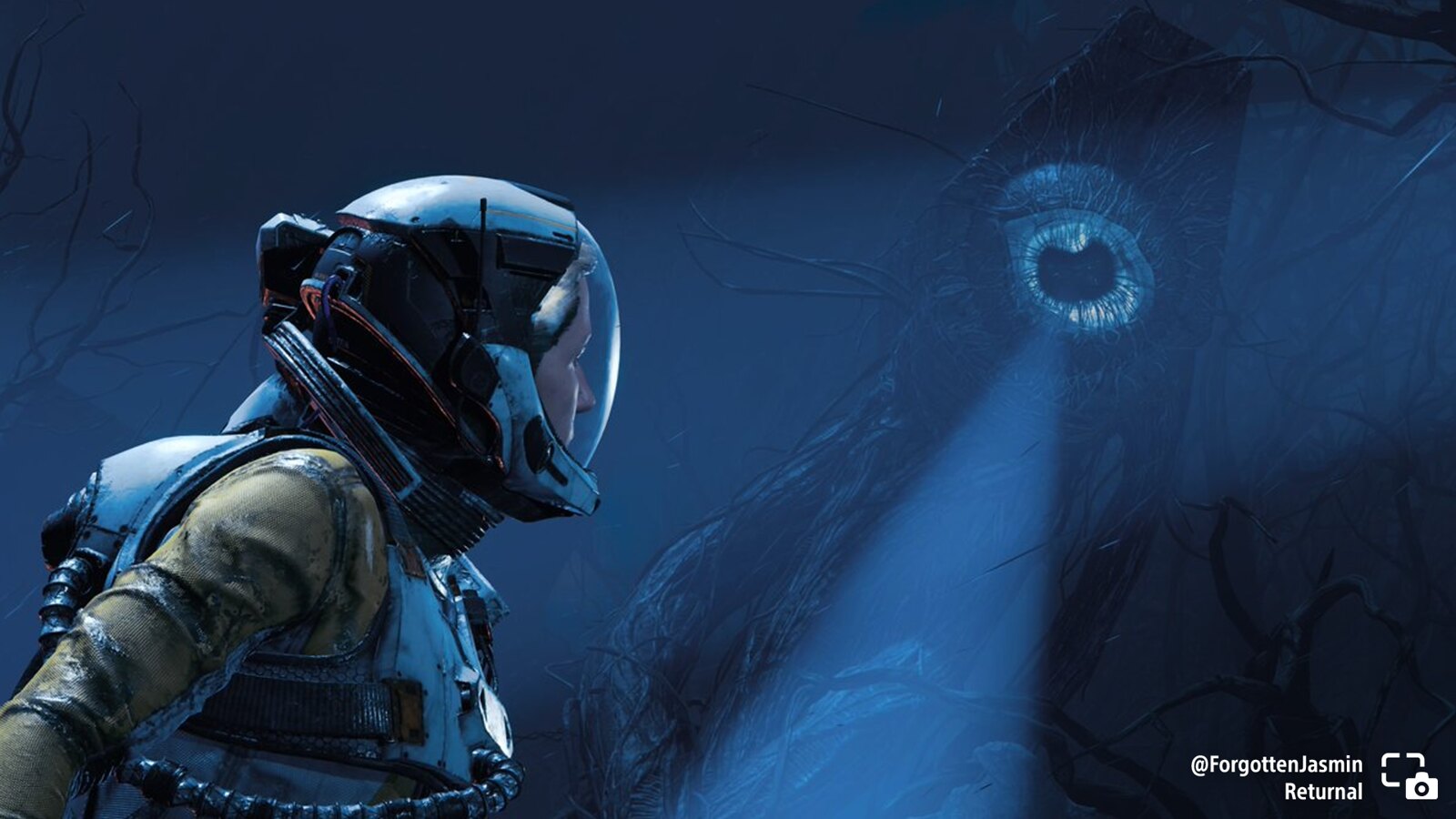 ForgottenJasmin shares Seline leaning away from a gnarled creature with a gigantic single eye in Returnal.