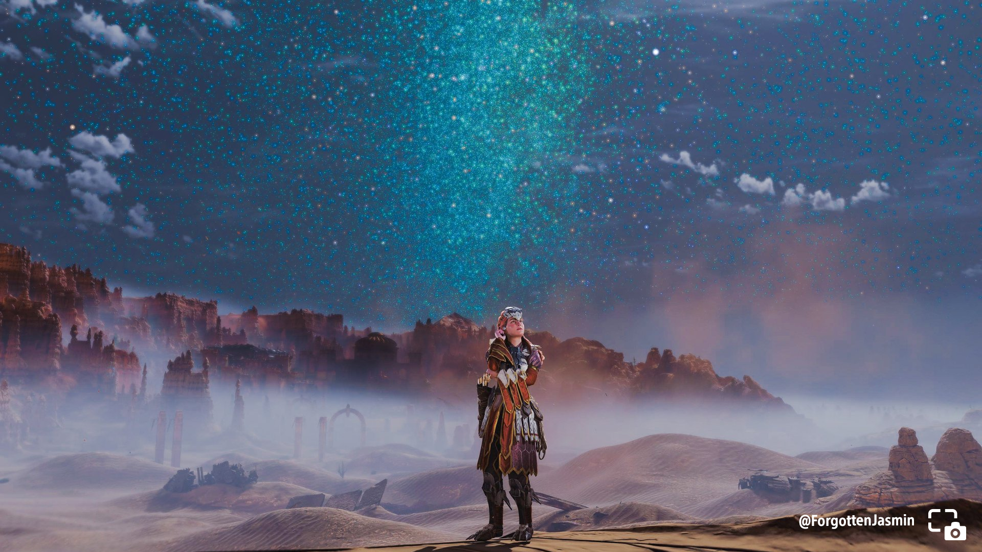 ForgottenJasmin shares Aloy gazing up at the illuminated night sky from a desert valley.