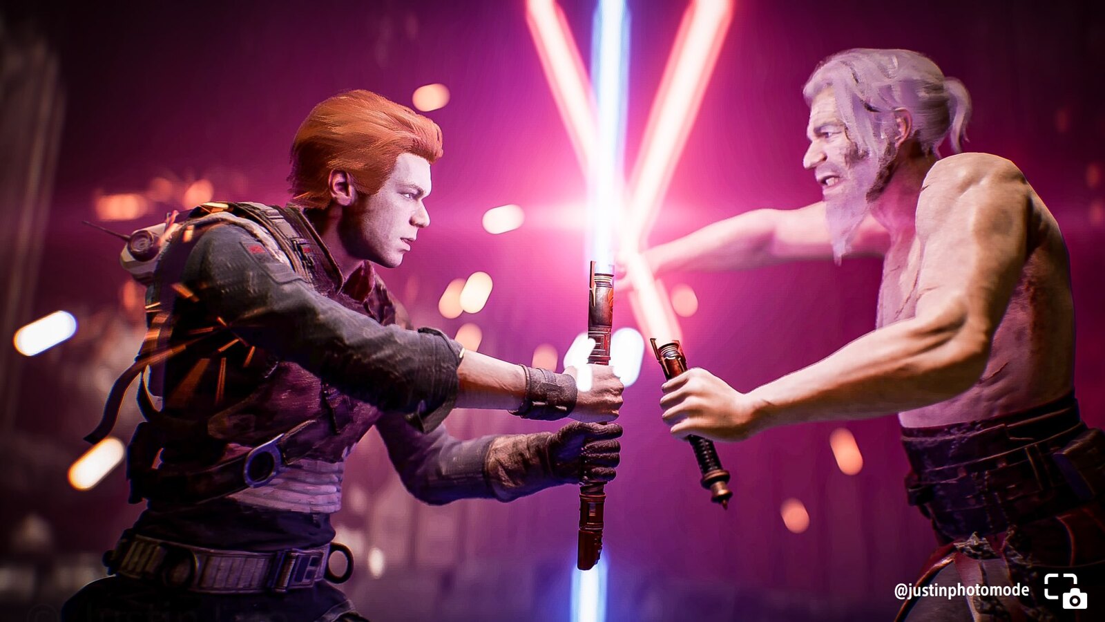 justinphotomode shares Cal clashing with another character wielding a red lightsaber in both hands