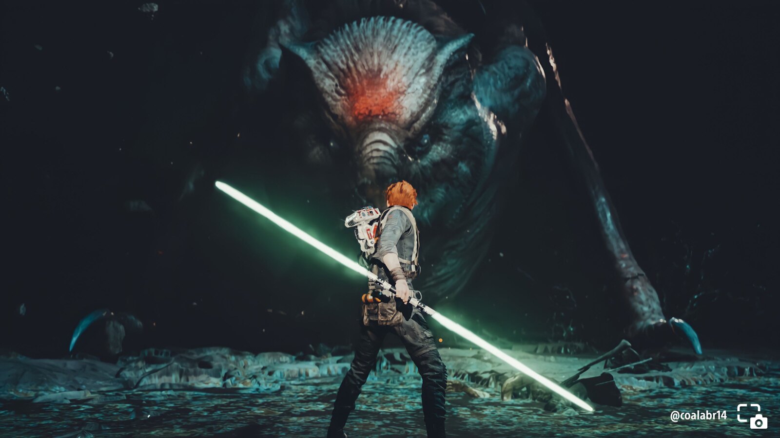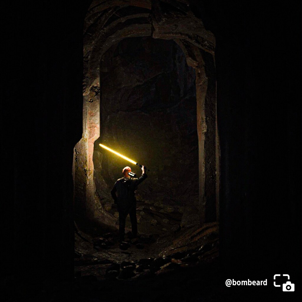 bombeard shares Cal raising a yellow lightsaber in a dark cavern.