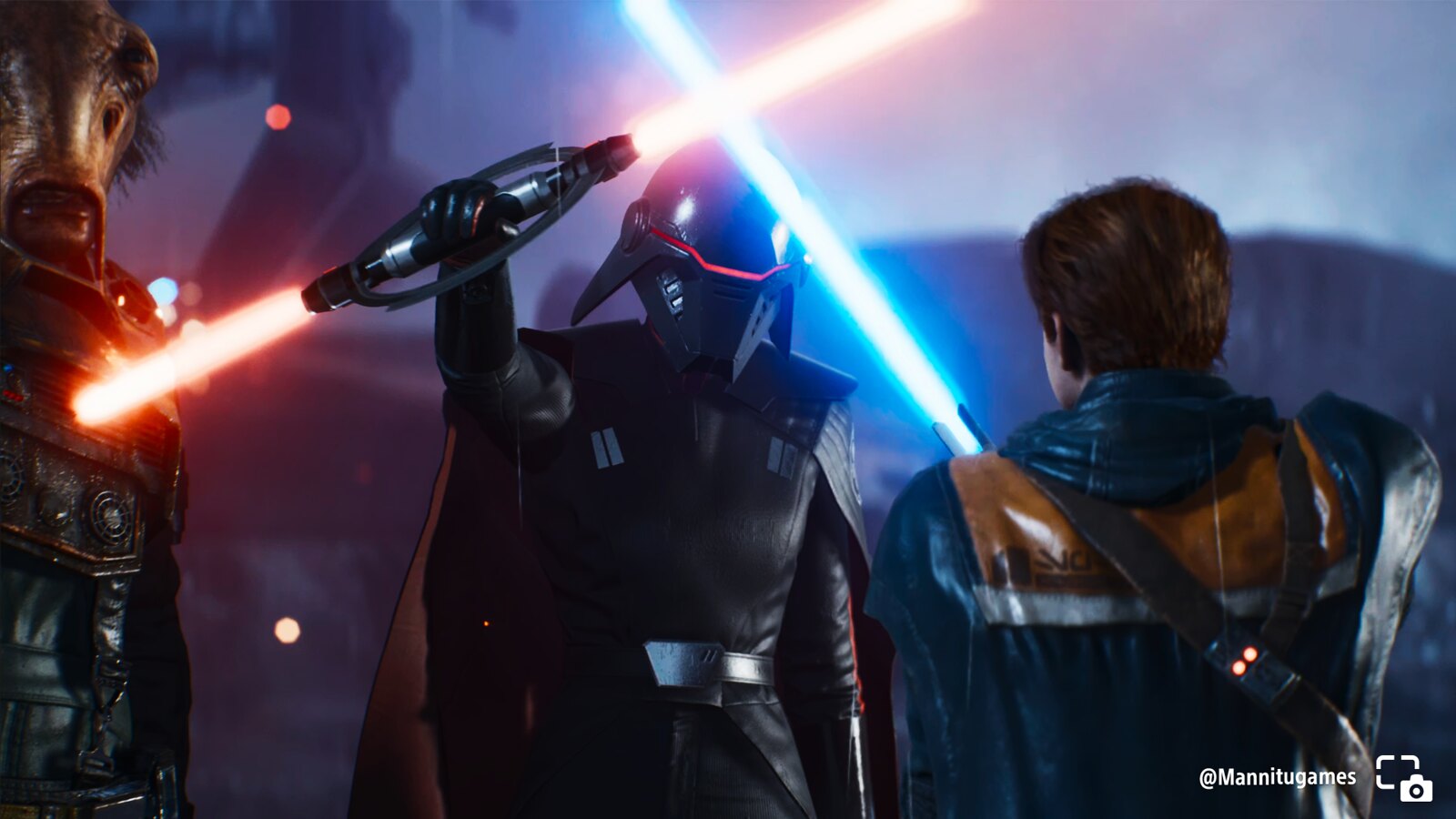 Mannitugames shares Cal raising his blue lightsaber against the Second Sister’s red lightsaber.