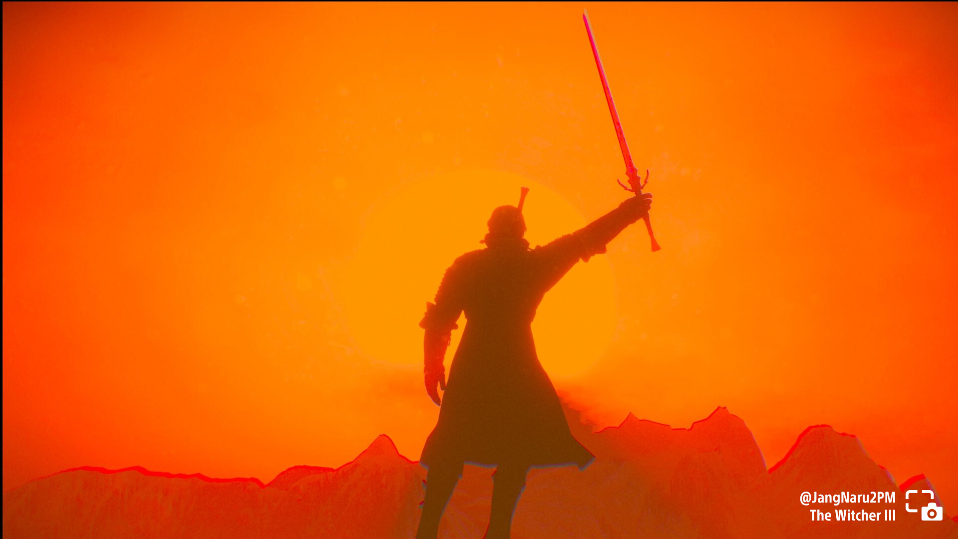 JangNaru2PM shares Geralt raising a sword to the orange sun in The Witcher III.