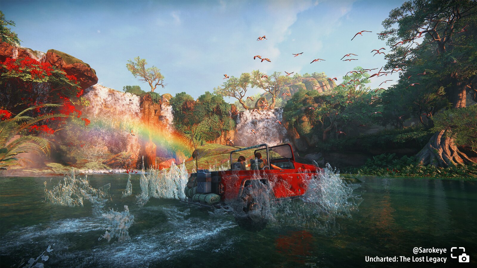 Sarokeye shares Chloe and Nadine driving the jeep past a rainbow in Uncharted: The Lost Legacy.