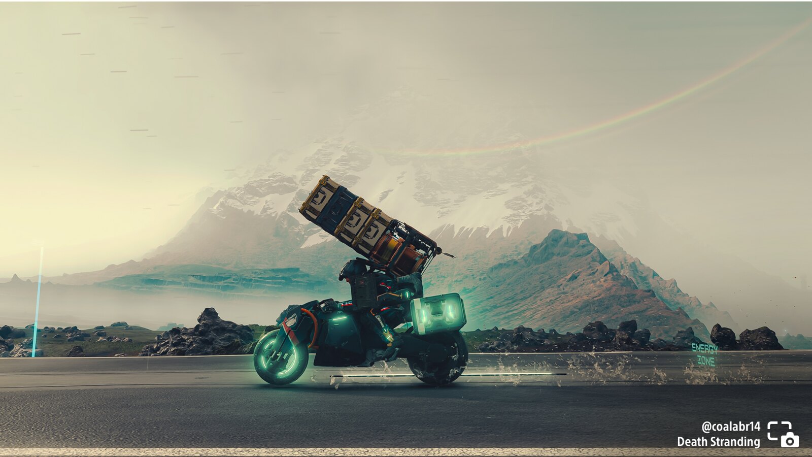 coalabr14 shares Sam riding past a distant rainbow in Death Stranding.