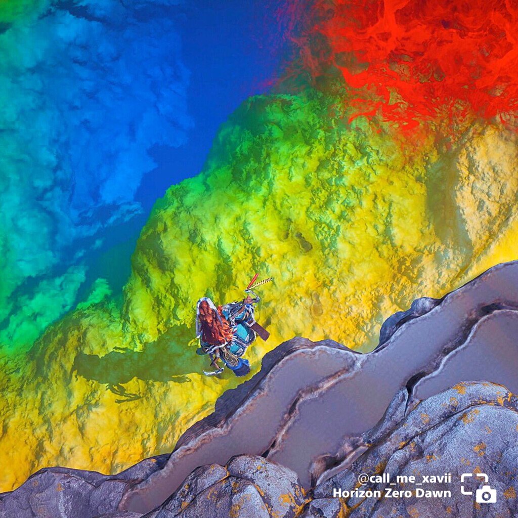 call_me_xavii shares Aloy wading in a pool of water filled with colorful oil in Horizon Zero Dawn.