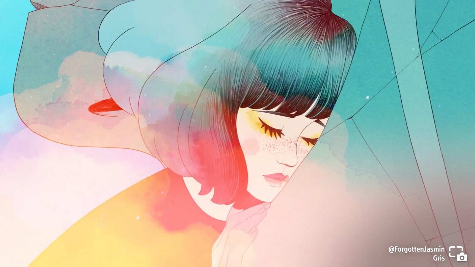 ForgottenJasmin shares a hug against a soft rainbow-colored backdrop in Gris.