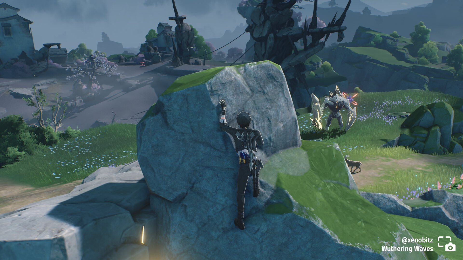 xenobitz shares Rover preparing a sneak attack from behind a boulder in Wuthering Waves.