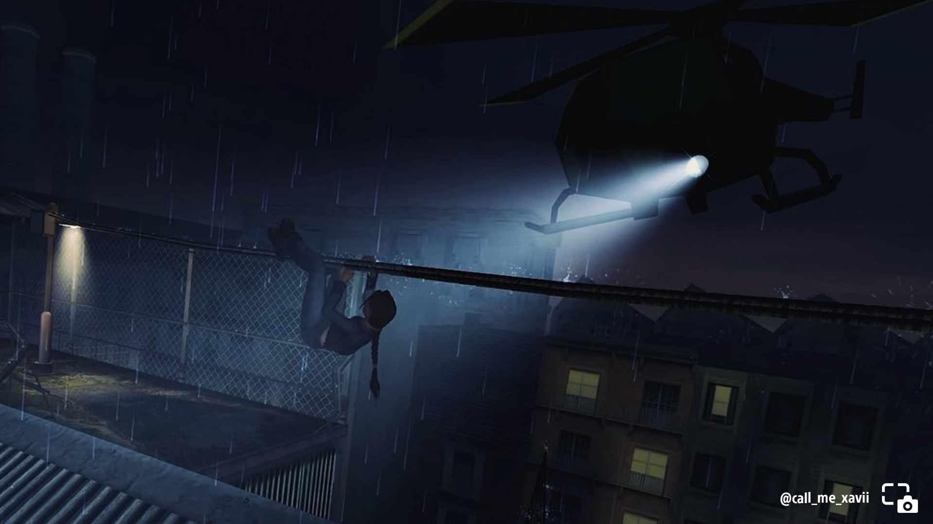 call_me_xavii shares Lara crossing a rope highlighted by a helicopter spotlight