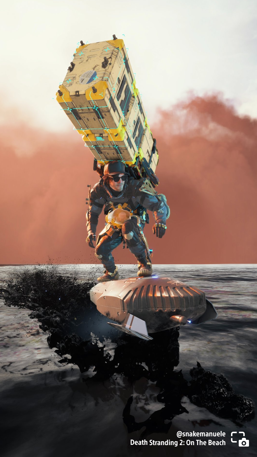 snakemanuele shares Sam riding a coffin board through the desert in Death Stranding 2: On The Beach