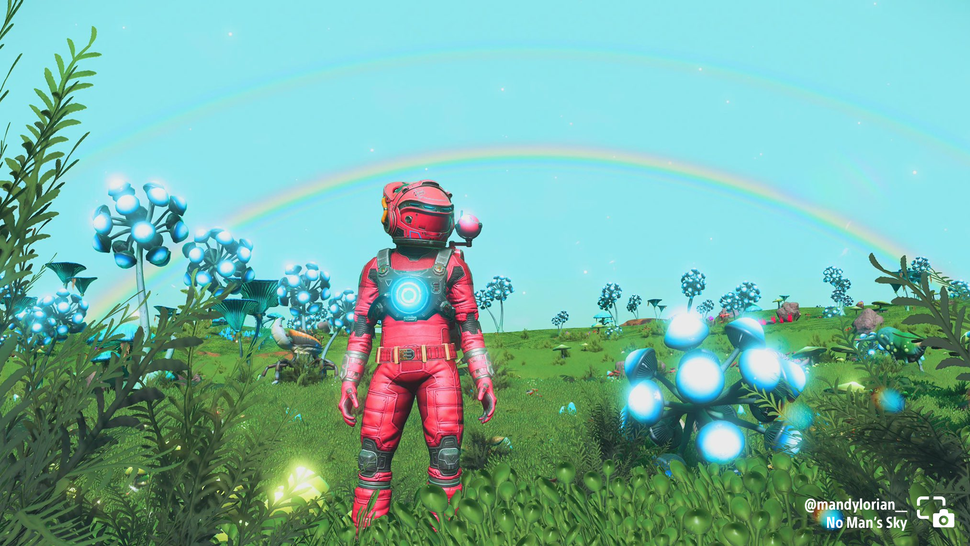mandylorian__ shares their space adventurer exploring a colorful planet in No Man’s Sky.