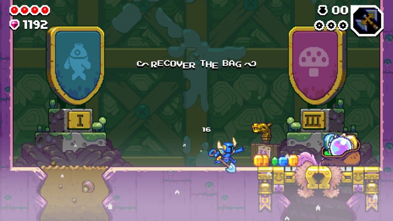 Rather than moving right through a beautifully pixelated stage, Dig tasks players with digging down, deeper and deeper into procedurally generated levels. This presents new feelings in the pantheon of emotions I feel while playing a Shovel Knight game: urgency and stress. Unlike many platformers out there, you can’t take the time to observe where you must go and how best to get there. You have to keep digging down and while going back up a few spaces is possible, it’s not easy. You’re not meant to backtrack because your goal is far below you. If you miss some gems or one of the stage’s three machine cogs, which unlock a special bonus reward, you probably missed your chance.