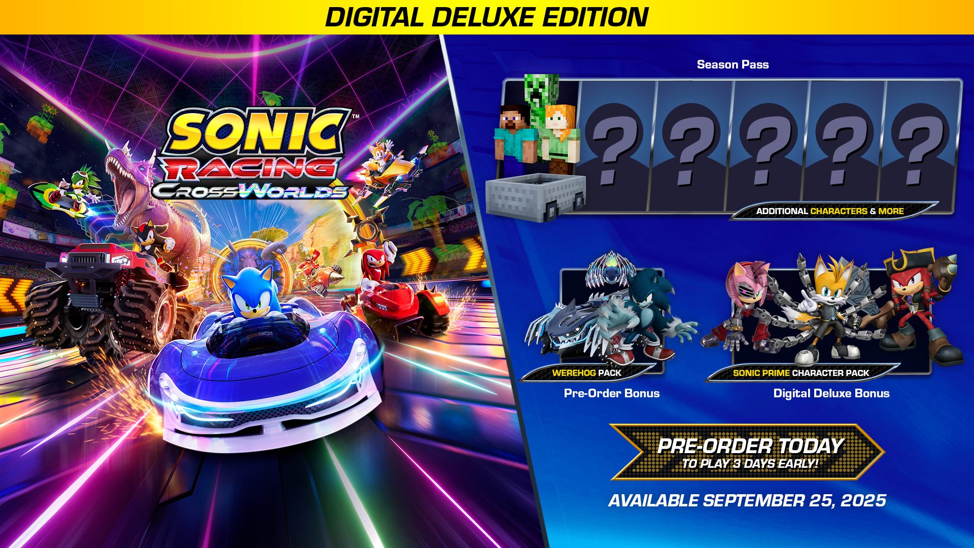 Sonic Racing: CrossWorlds is racing onto PlayStation 5 and PlayStation 4 in style, releasing in both Standard and Digital Deluxe editions. Grab the Digital Deluxe edition to jump into the race three days early and expand your rosters with even more racers, including characters from the hit Netflix series Sonic Prime! Plus, the Digital Deluxe edition includes the Season Pass, which is packed with bonus characters, vehicles, and new tracks inspired by other worlds and franchises – all to be revealed and released in the future!