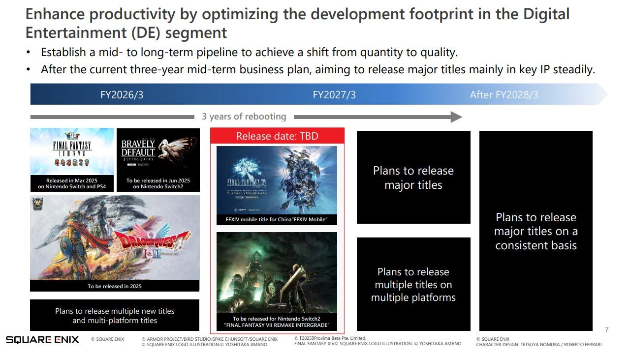 According to Square Enix, it plans to adopt a multiplatform approach for its games, leading to “major” titles being released on a consistent basis starting March 2027. All of its game titles will be placed “under the management of the same studio,” and this will allow all of its in-house knowledge to be “consolidated, accumulated, and shared,” Square Enix added. This new approach has also resulted in several in-development games being canceled, as Square Enix decided to focus its resources on funding other projects instead.