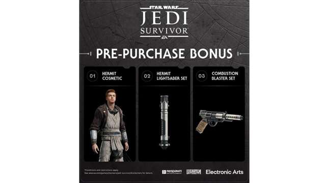 All purchases come with the Jedi Survival Cosmetic Pack. This includes three items inspired by Obi-Wan Kenobi–the Hermit Cosmetic for Cal, the Combustion Blaster skin, and the Hermit Lightsaber skin. We haven’t seen any retailer-exclusive bonuses yet, but keep your eyes peeled for announcements in the coming months.