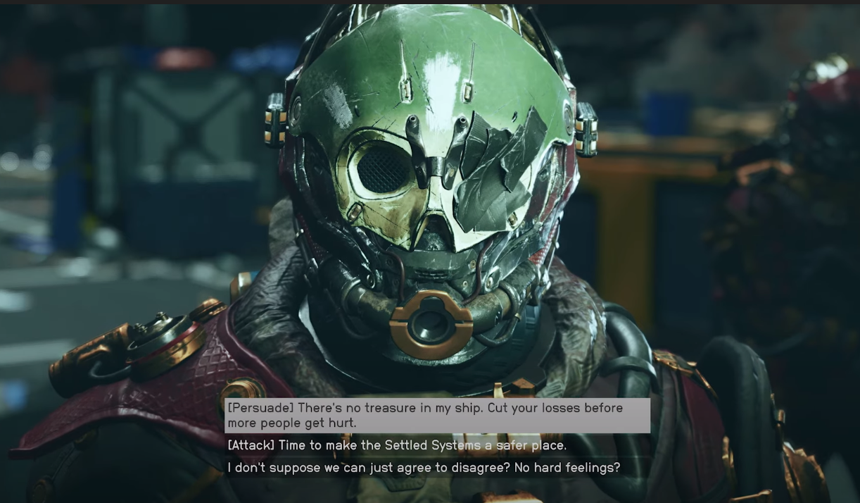 Howard also talked about the persuasion system, saying players will spend points to persuade characters to get what they want. The example shown had four different dialogue options on screen, with each one costing a different amount of points. The +1 option was passive, with the +5 option being very aggressive. This lines up with what we’d previously heard, when Bethesda said Oblivion’s dialogue mini-game was inspiration in Starfield.