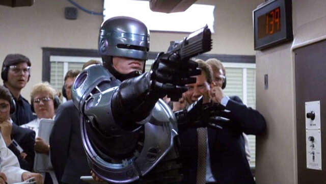 Detroit police officer Alex Murphy (Peter Weller) is murdered by a gang of criminals led by Clarence Boddicker (Kurtwood Smith) but is revived and turned into a cyborg cop by OCP, a powerful corporation. After his own police force turns against him, the same gang tries to finish off Robocop at an abandoned factory but this time Murphy has the upper hand. He covers one goon in toxic waste, shoots several others, and stabs Boddicker in the neck with what is essentially a pointy thumb drive embedded in his arm.