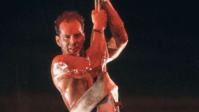 Mistaken for a terrorist by FBI agents in a helicopter, New York City cop John McClane (Bruce Willis) is desperate to get off the rooftop of the Nakatomi Building, which is rigged to explode. With nowhere to go, McClane ties himself to a firehose and jumps from the building as the roof ignites, destroying the helicopter. Dangling from the side of the building, McClane shoots his way inside and manages to free himself before almost being dragged down by the falling hose.