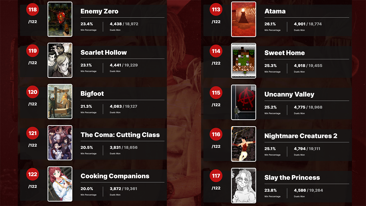 On the other end of the spooky spectrum stands Cooking Companions, the game with the least amount of wins at 20%. It was joined by games like The Coma: Cutting Class, Bigfoot, Scarlet Hollow, and Enemy Zero.