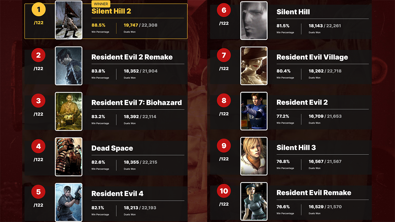 So, after 1.2 million battles with matchups like Resident Evil 4 vs. Dead Space and Silent Hill vs. P.T., which game earned the right to be called the greatest horror game of all time? Bloody drumroll please…
