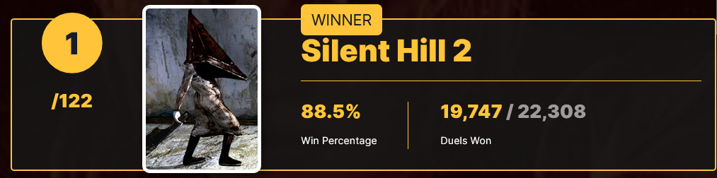 Pyramid Head fans, rejoice! Silent Hill 2 has won our horror game face-off with a commanding win percentage of 88.5%. The game from 2001 that is officially getting a remake from The Medium’s Bloober Team won 19,747 of its 22,308 duels, indicating that the idea of a remake was probably a great decision.